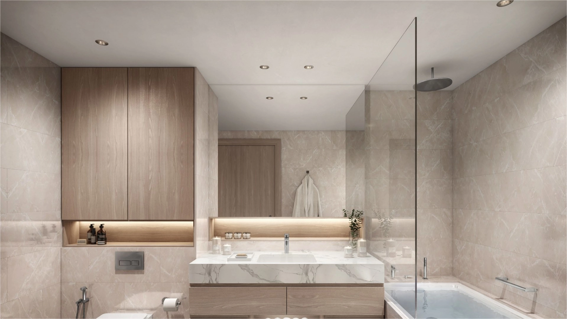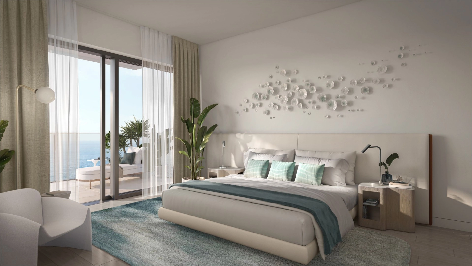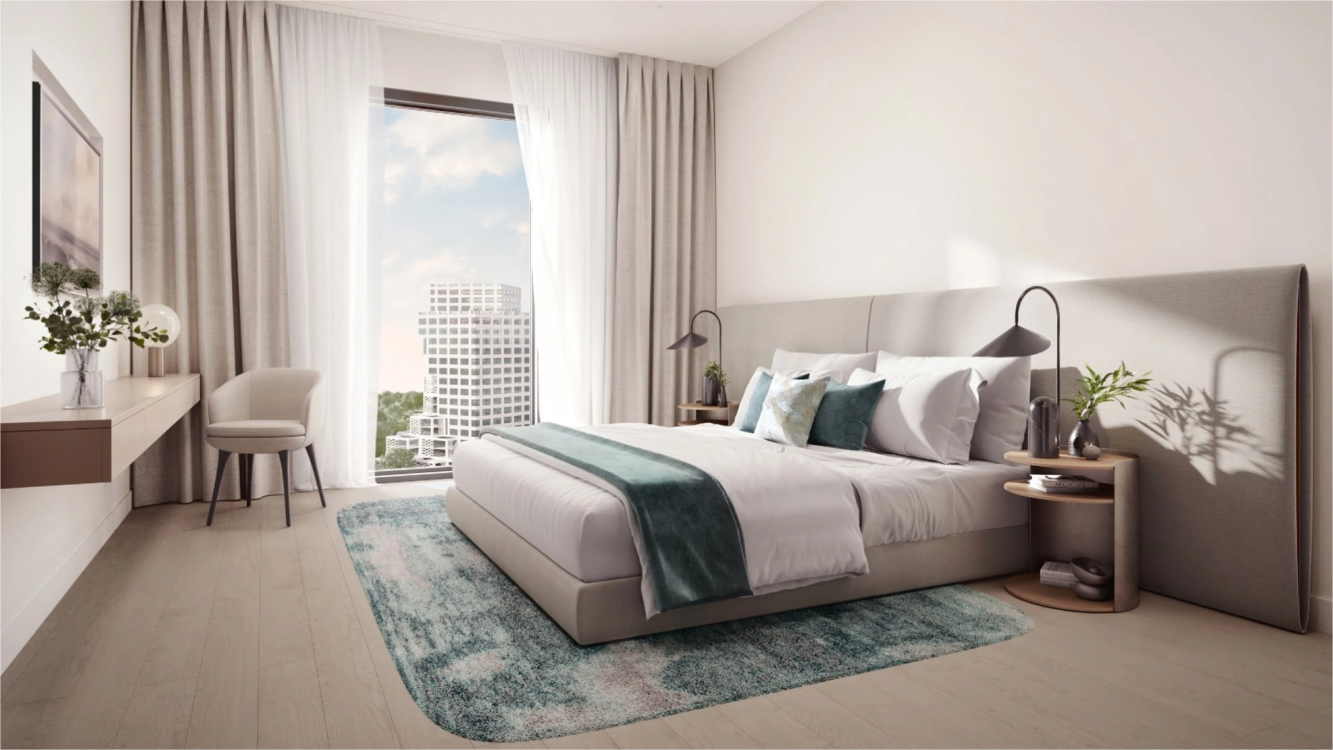 Each apartment at Sunstone is crafted as an ode to the horizon. Sophisticated, timeless interiors feature natural tones and textures that reflect the seaside surroundings, creating a warm and serene living environment. The material palette includes warm touches of wood, delicate silk-inspired finishes, light timber tones and reconstituted stone surfaces. Kitchens come with built-in appliances, while spacious balconies open to panoramic views of the sea, Saadiyat Islands or the vibrant Makers District skyline.