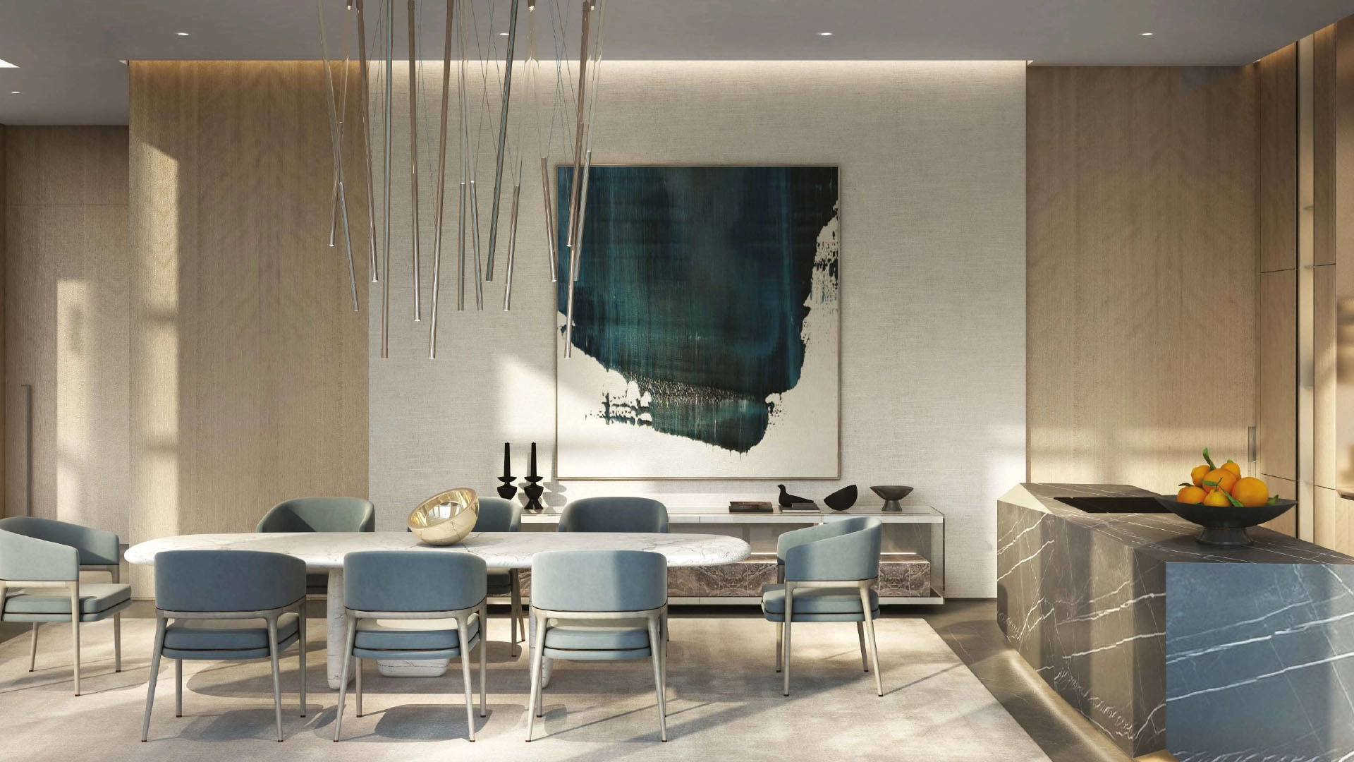 One-bedroom homes range from 749 to 1,139 square feet, while two-bedroom homes measure between 1,430 and 1,785 square feet. Three-bedroom homes are approximately 2,125 square feet, and four-bedroom homes can reach up to 3,103 square feet. Sky Villas feature four bedrooms, and the top penthouses offer five bedrooms. Each unit includes open kitchens, bright living rooms, and spacious balconies. Additionally, they come equipped with smart controls, built-in storage, and calming finishes.