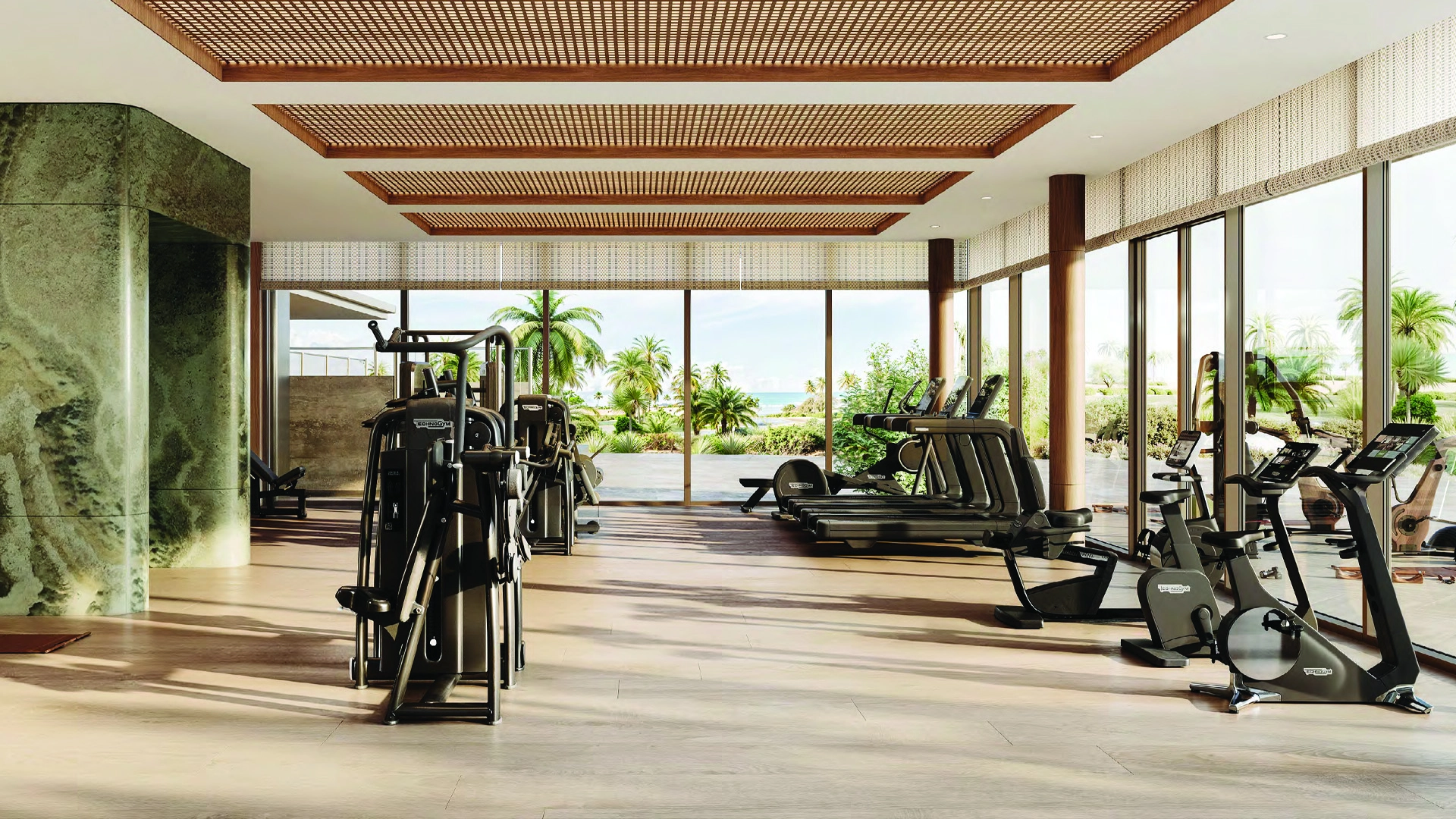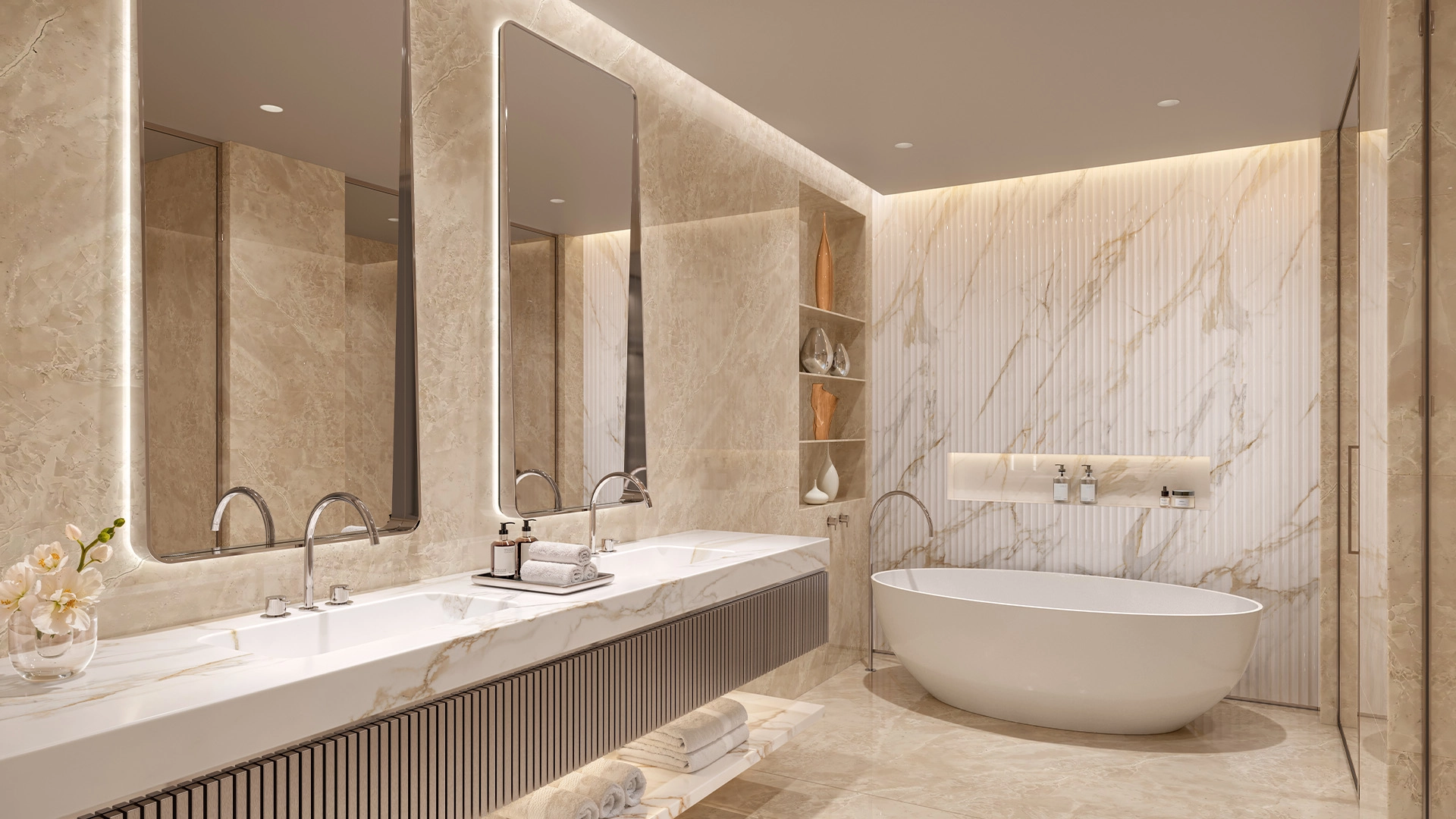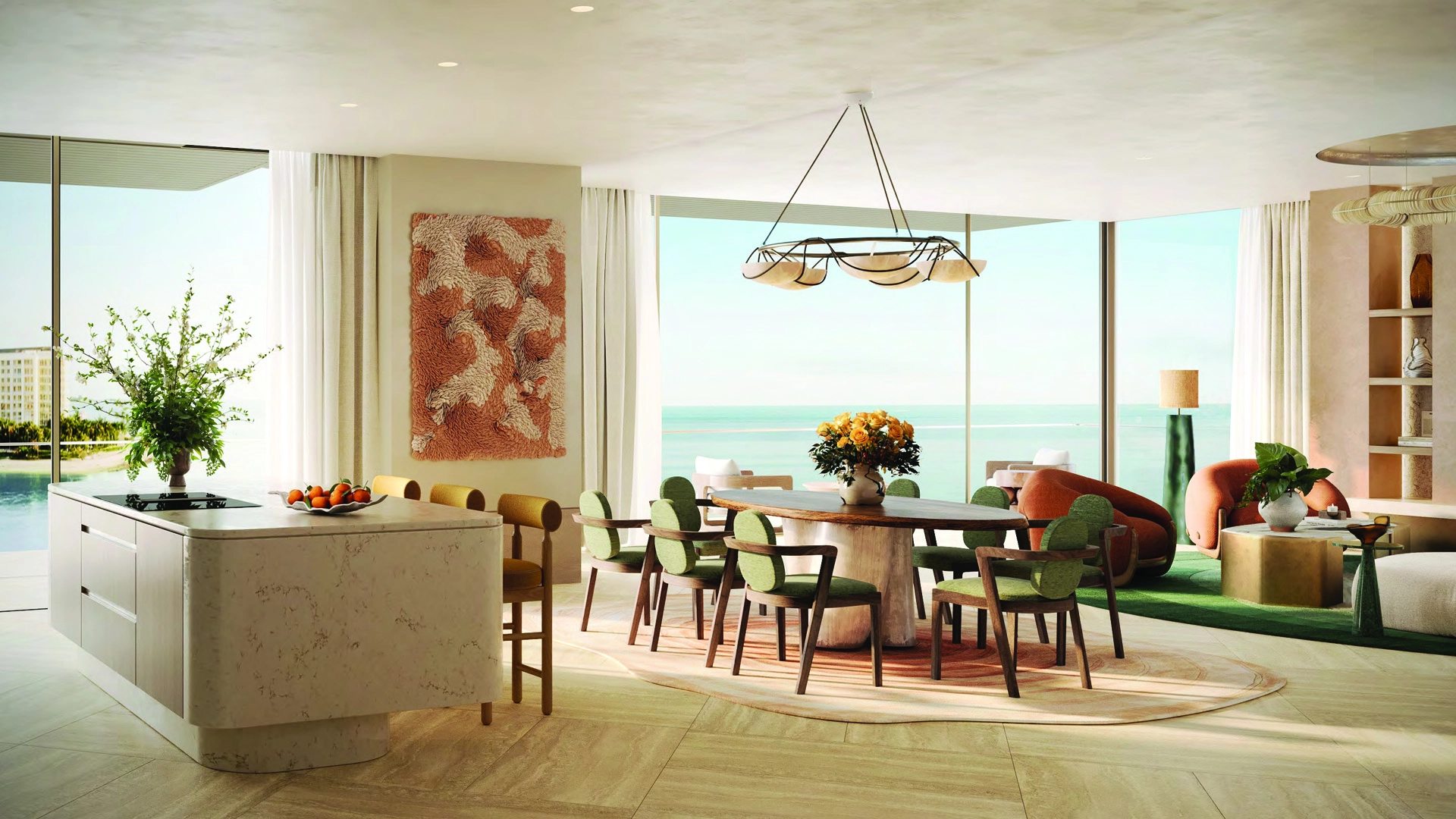 Skidmore, Owings & Merrill designed the tower to resemble a desert flower, featuring curved balconies arranged like petals. The use of warm stone, expansive glass, and shade fins helps to reduce heat while allowing fresh air to flow in. The ground-level gardens, cascading pools, and a grand entrance framed by palm trees create a resort-like atmosphere.