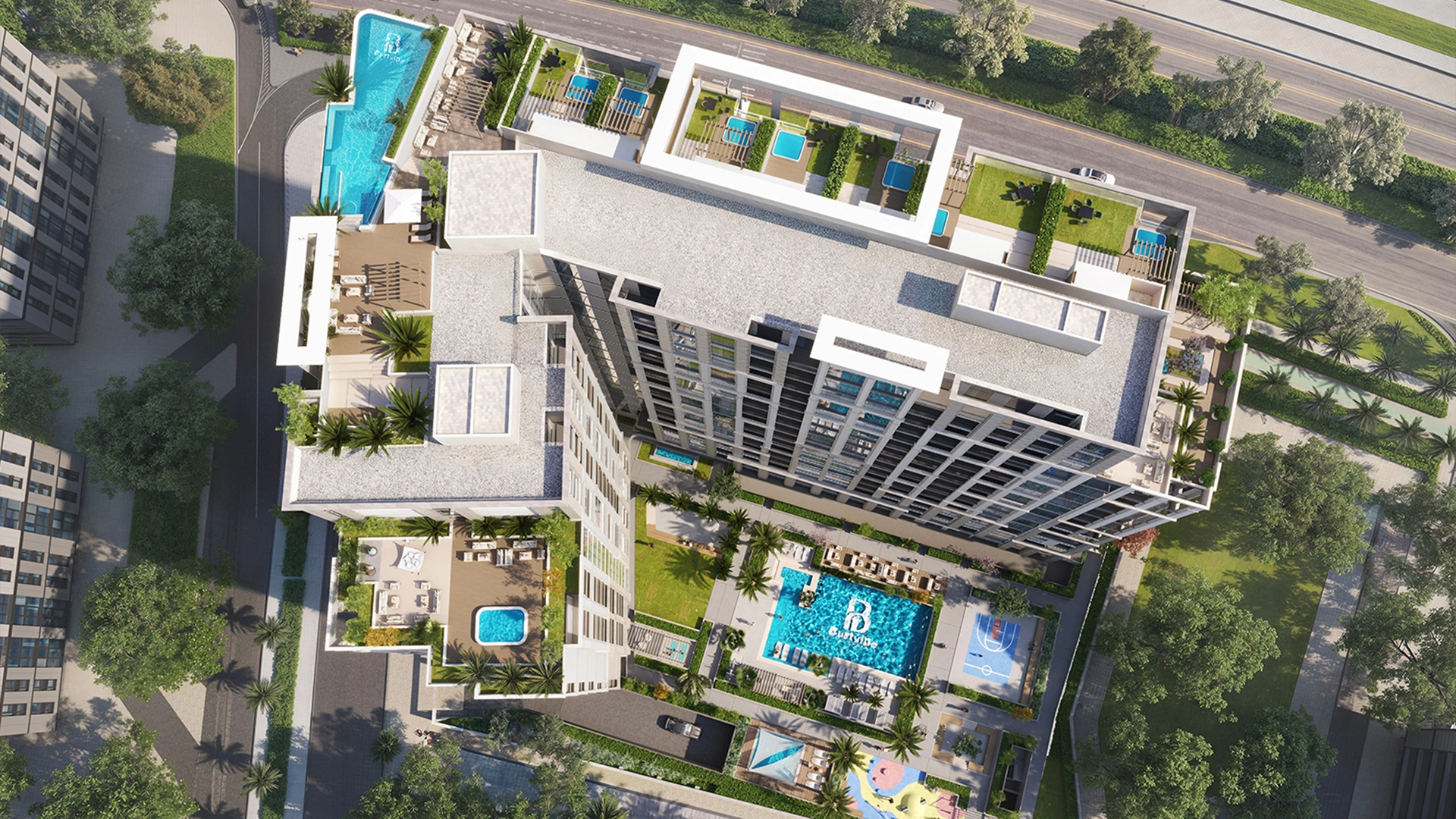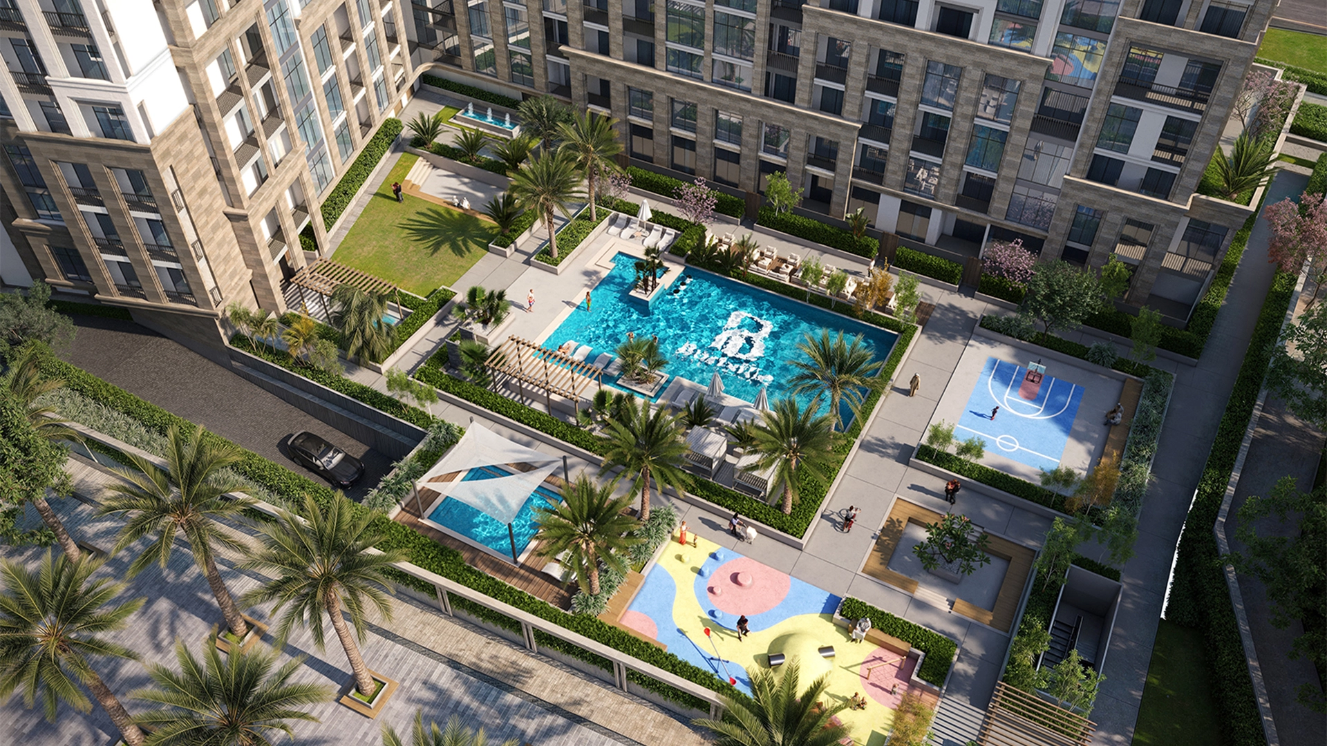 Infinity and outdoor pools, kids’ pool and splash park, health club/gym, sauna and jacuzzi, kids’ play area, outdoor cinema, rooftop café with outdoor cinema, landscaped areas, shaded seating, parking, elevators, in-residence dining and shuttle service.