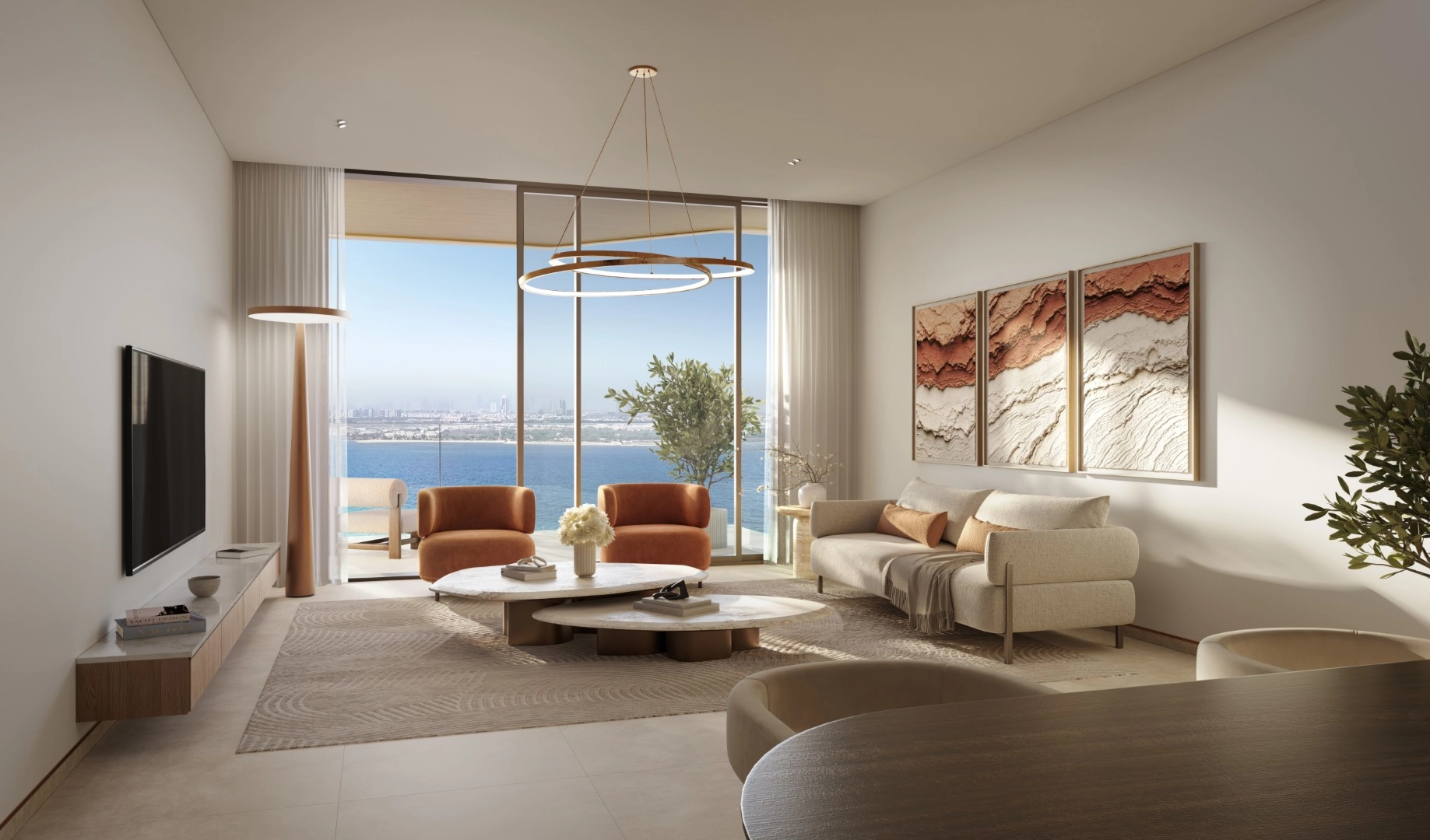 Light, coastal architecture with soft stone tones and expansive glass. Extended balconies and shaded terraces frame sea and city views.
