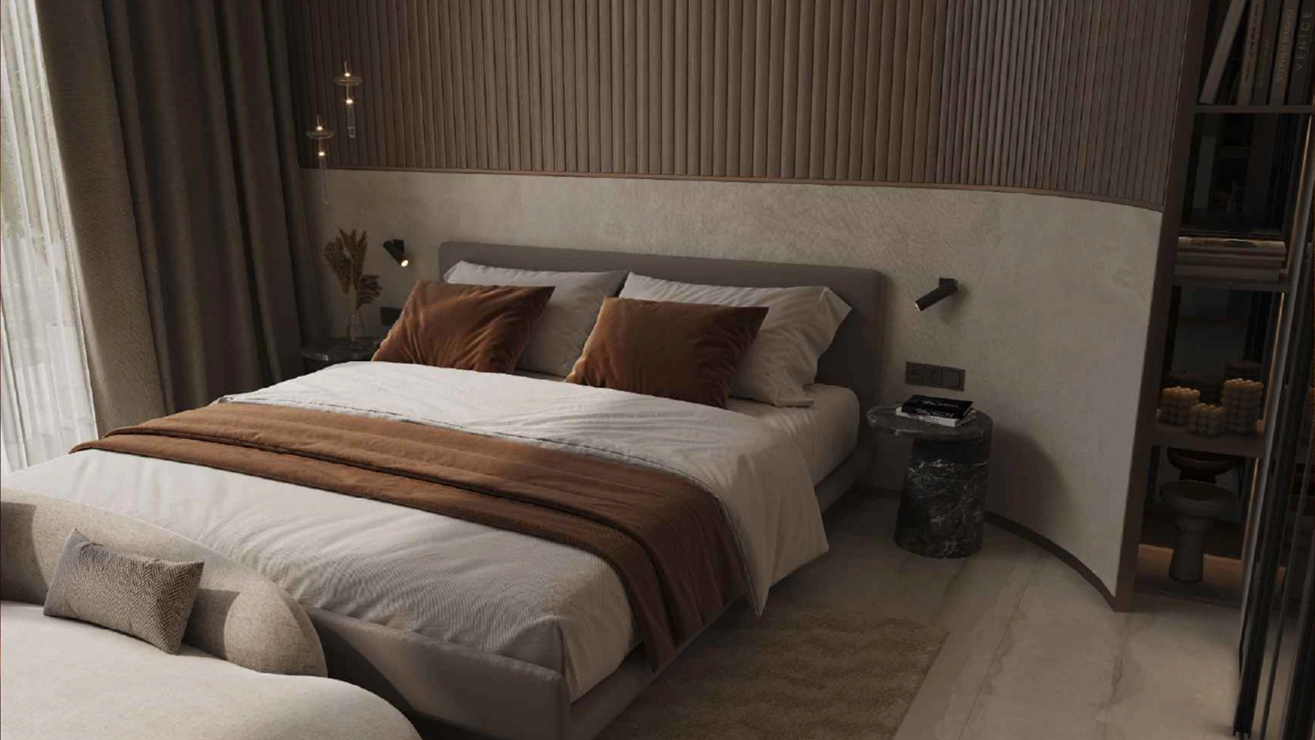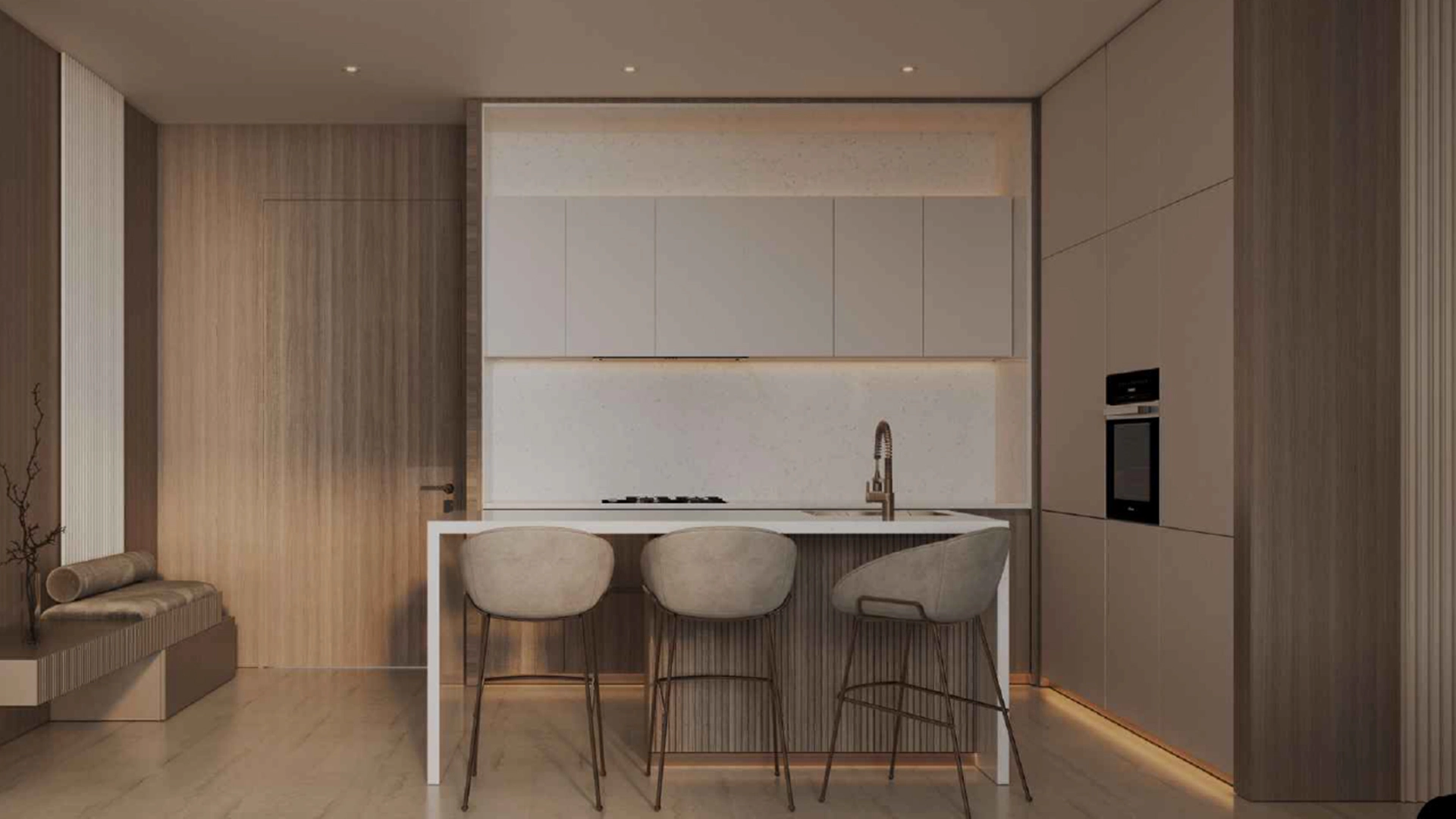 The homes emphasise natural light, ample storage, and simple furnishings. Studio and one-bedroom layouts feature open living spaces, equipped kitchens, built-in wardrobes, and full-height windows. The finishes incorporate oak tones, travertine, and bronze details, creating a clean and contemporary aesthetic. Select models include balconies that extend the living space outdoors.