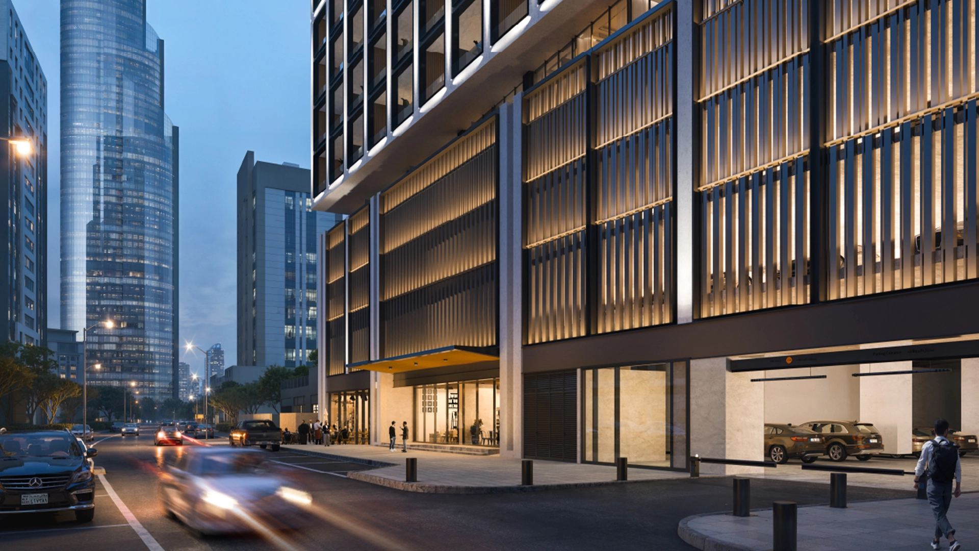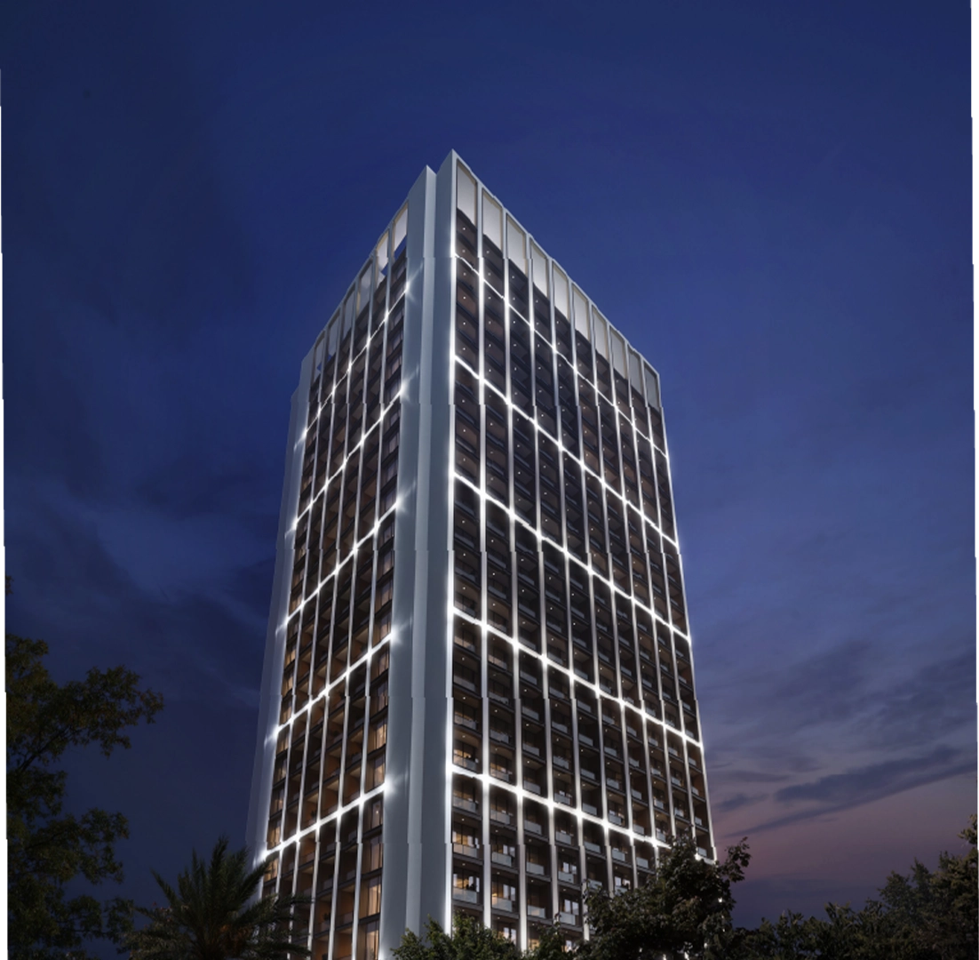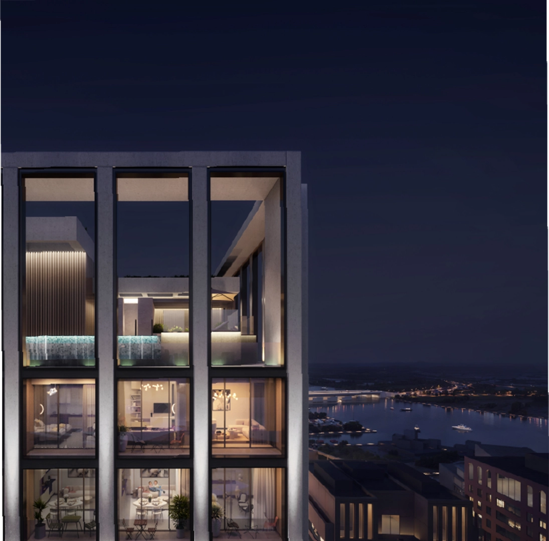 The tower features a sculpted profile and crystalline glazing designed to capture and reflect daylight from dawn until dusk. A clean grid, brass accents, and energy-efficient materials contribute to its refined appearance. The structure includes multiple basement levels and a podium, topped by a residential tower, each element crafted for efficiency and light.