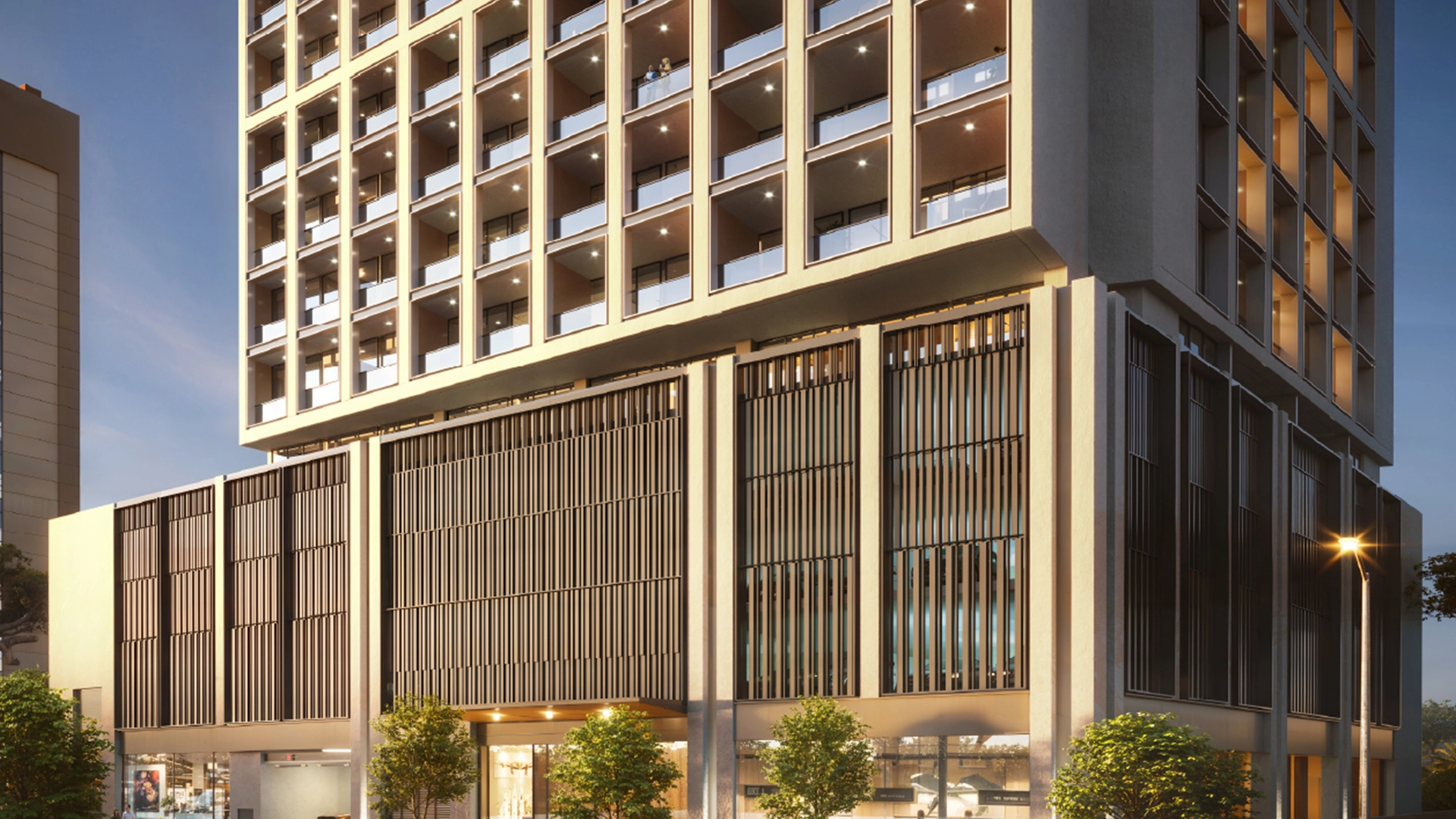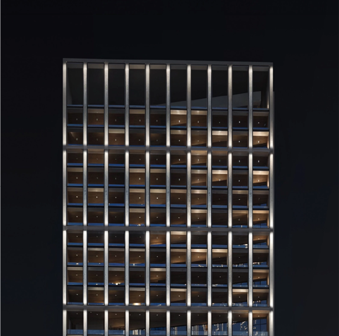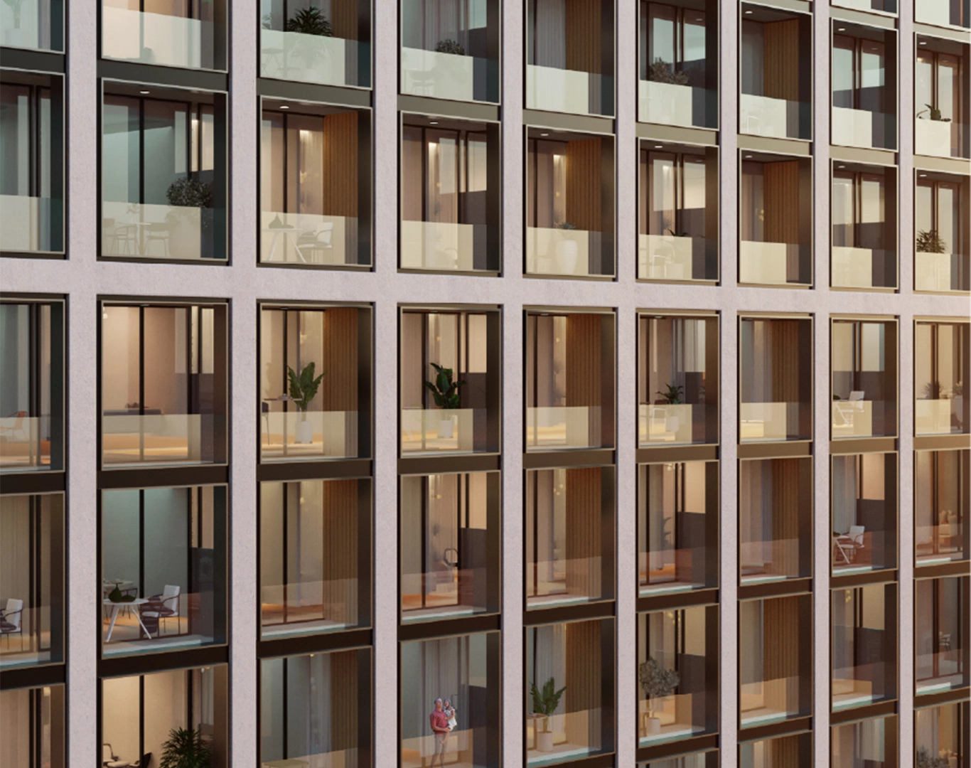 The tower features a sculpted profile and crystalline glazing designed to capture and reflect daylight from dawn until dusk. A clean grid, brass accents, and energy-efficient materials contribute to its refined appearance. The structure includes multiple basement levels and a podium, topped by a residential tower, each element crafted for efficiency and light.