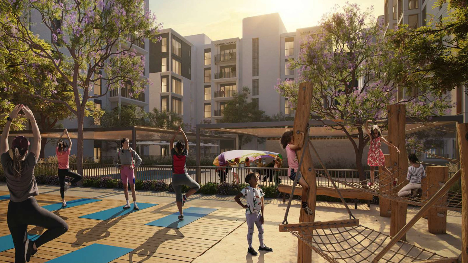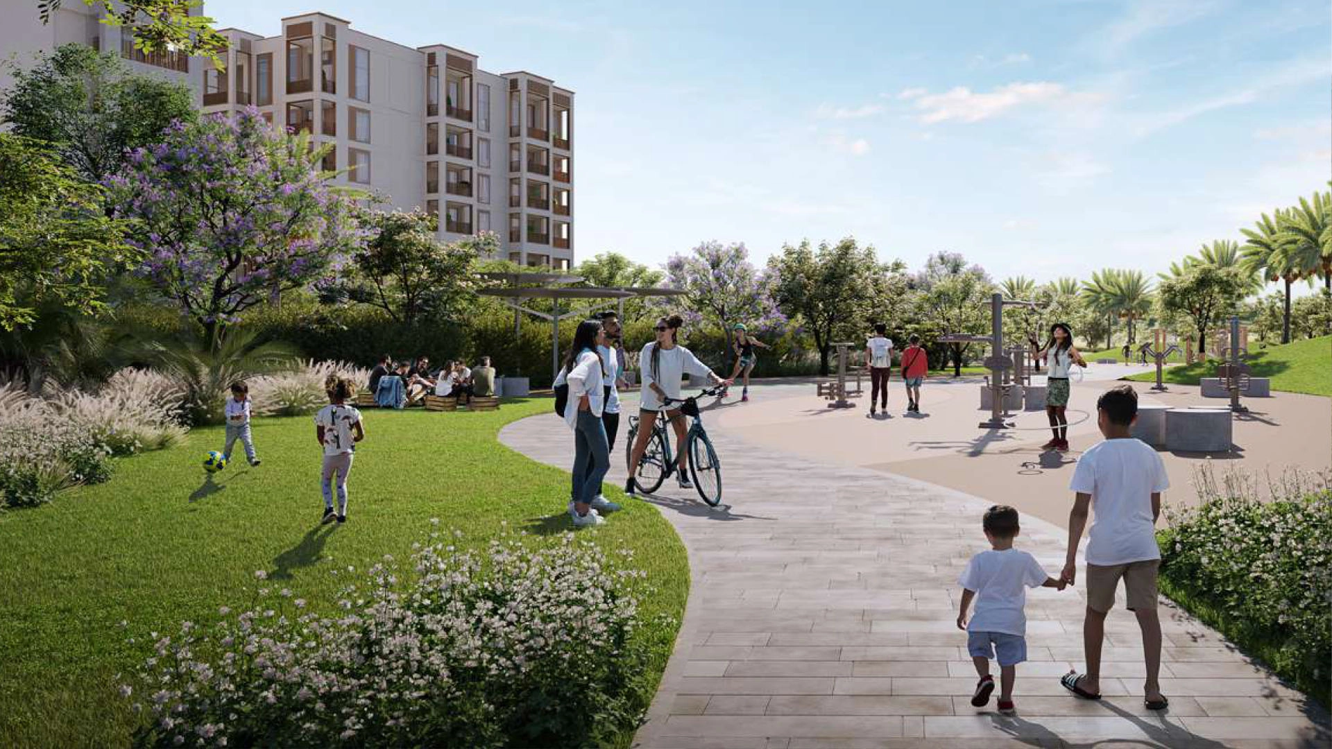 Pools, gym, co-working space, kids’ play areas, BBQ zones, and landscaped outdoor spaces.