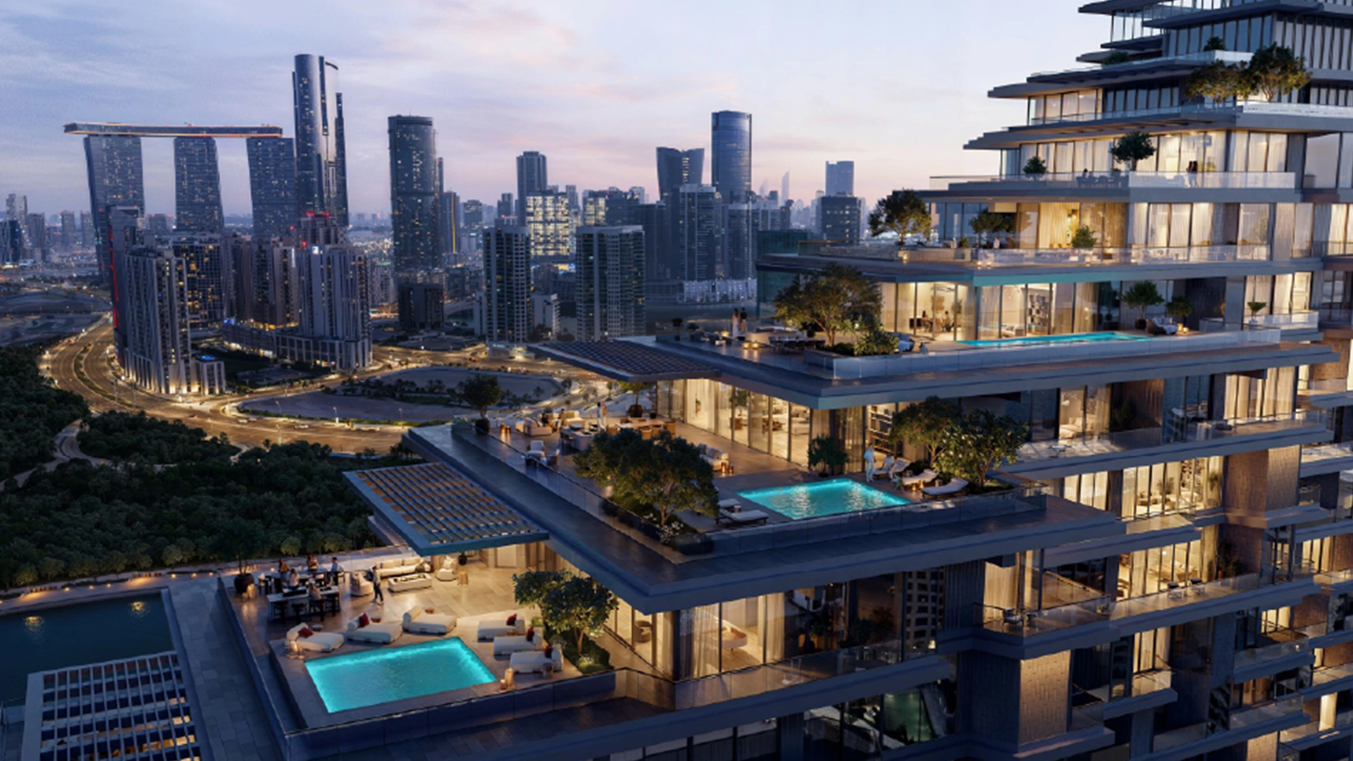 On the podium are an infinity pool, a kids’ pool, a gym, a spa, a yoga deck, a lounge, a cinema, play zones, cafés, a supermarket, and an EV charging station, all monitored by a 24-hour concierge.