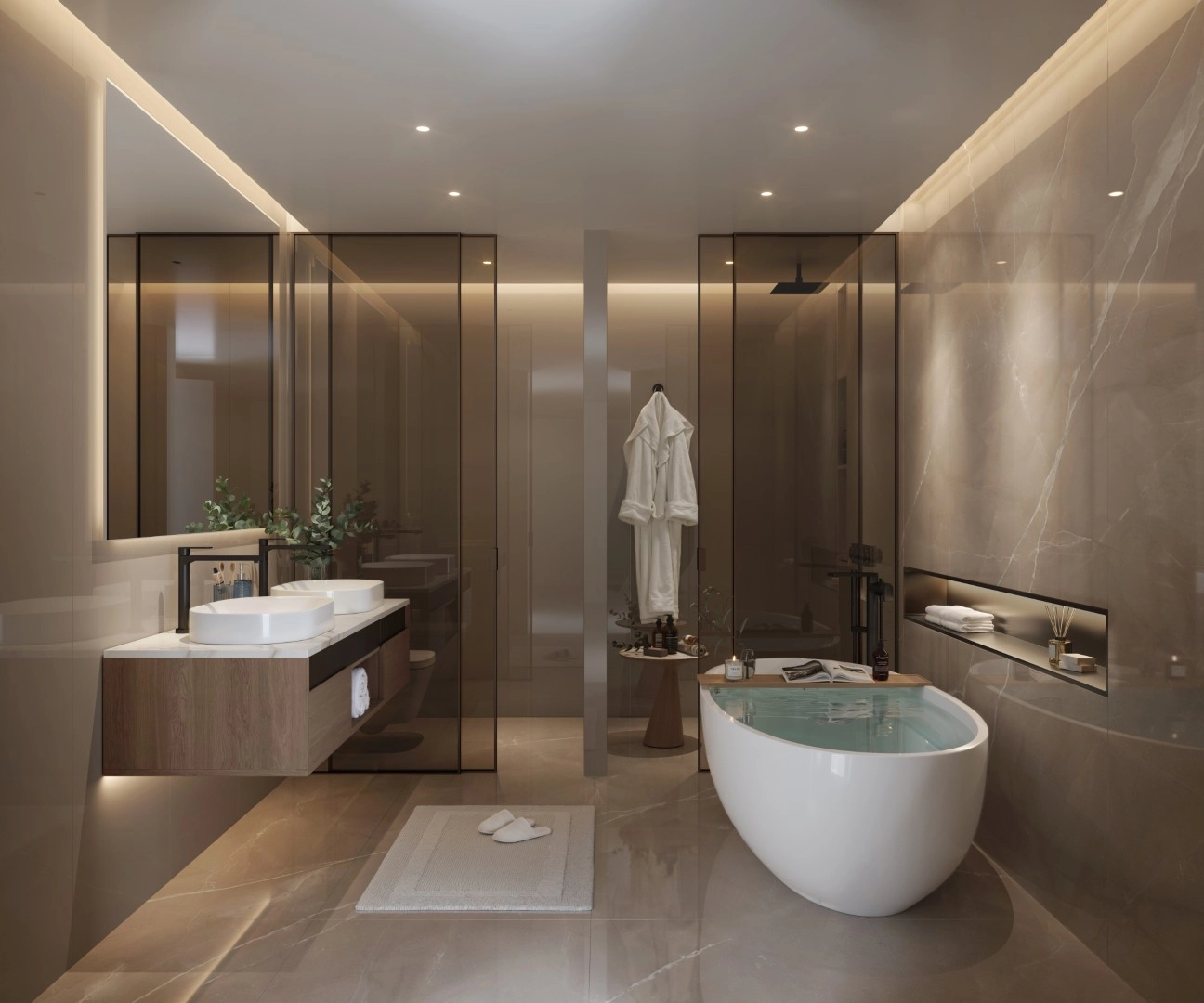 Buildings rise elegantly, made with pale stone, timber screens, and large glass panes. Deep balconies and rooftop shades help regulate sunlight while framing expansive views of the open sea or central parkland, ensuring that every residence enjoys a prime location with plenty of light and water.