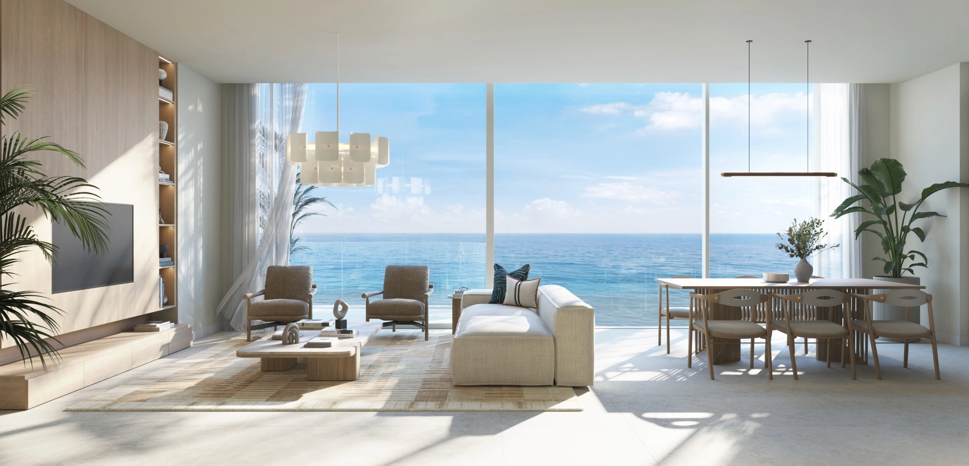 Seven mid-rise blocks with pale stone and timber screens, deep balconies and rooftop shades; interiors feature full-height windows, sea-facing terraces and larger plans with maid’s room.