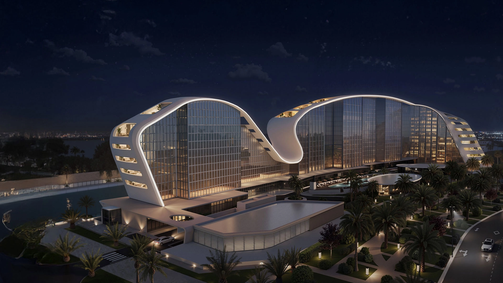 Architecturally, two sculpted, hotel-inspired buildings rise above a shared podium and curve toward the water to frame long canal views. Expansive glazing, rhythmic balconies, and landscaped edges soften the skyline, while the ground level activates the community with retail spaces and welcoming entry lounges.