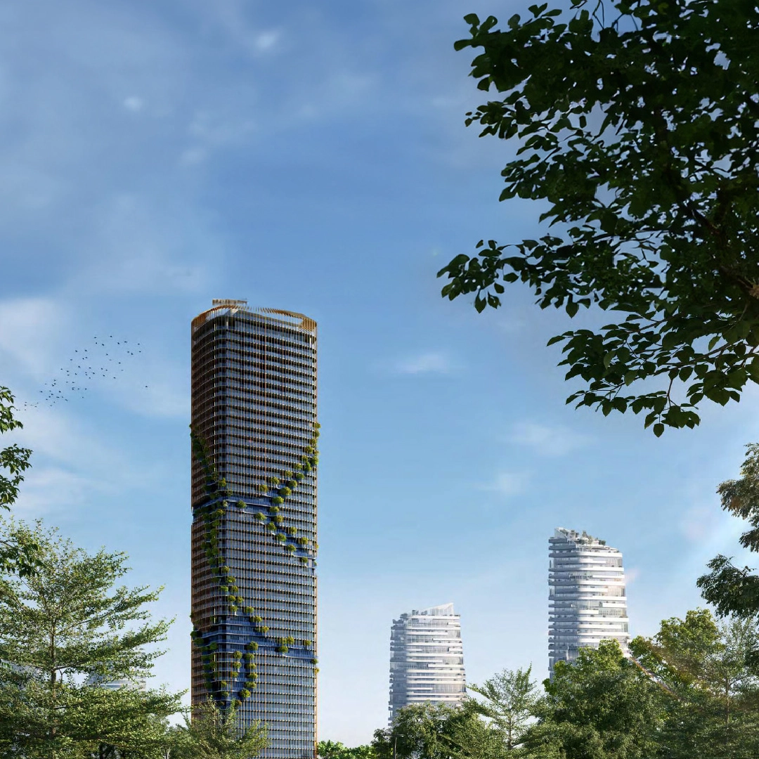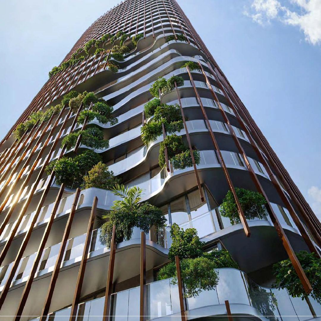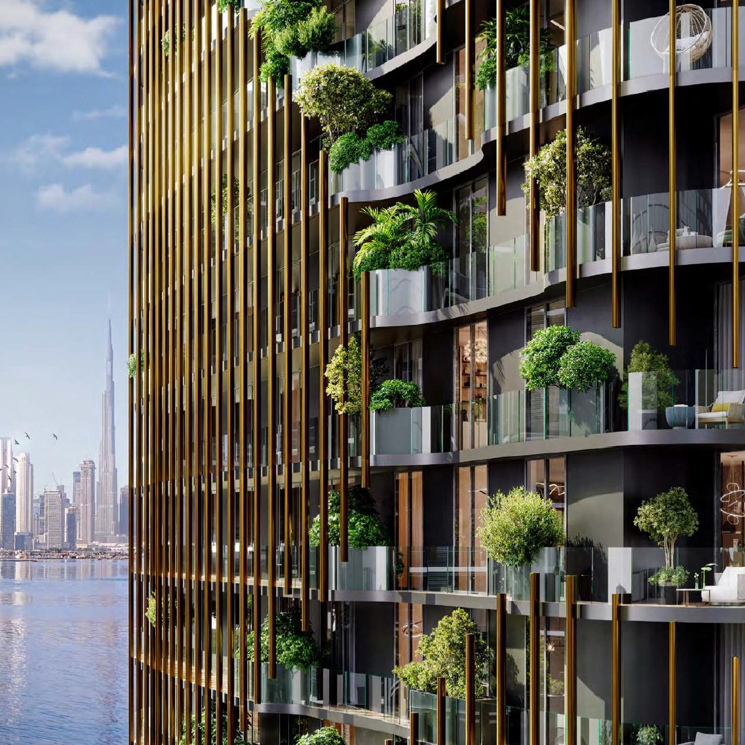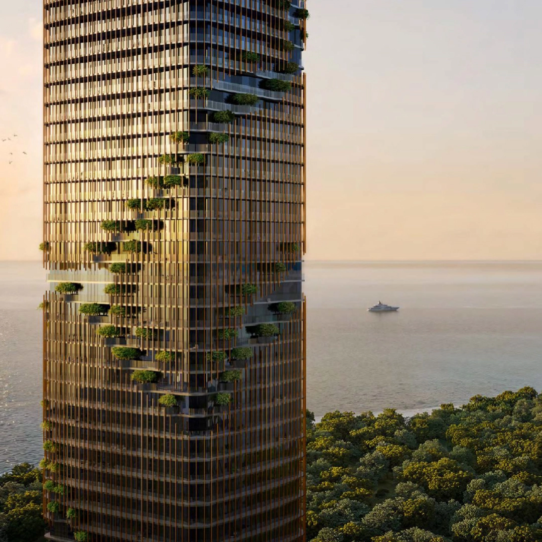 Sculpted double-layer façade | Bronze fins filtering sunlight | Green ribbon ascending the tower | Integrated hanging gardens | Panoramic 360° views of Downtown, World Islands & Port Rashid