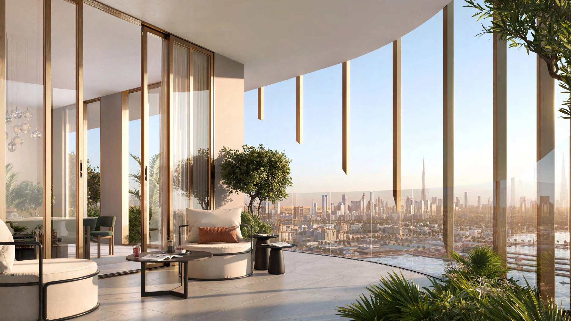 Homes at KANYON enjoy panoramic views of Downtown Dubai, the World Islands, Port Rashid, and the future forested district, creating dynamic horizons throughout the day.
