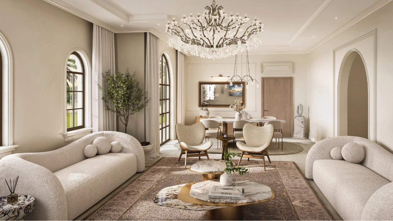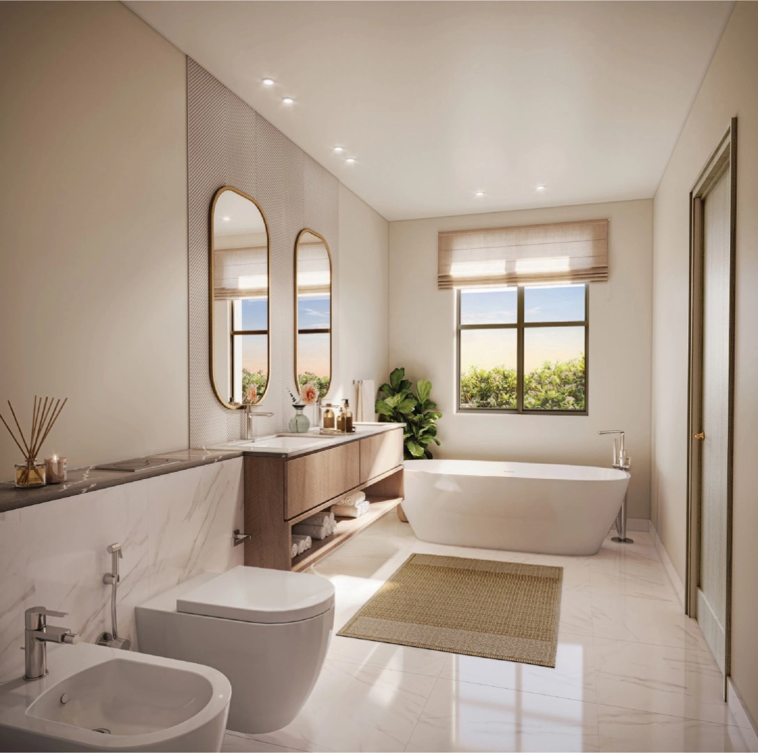 Open plans, thoughtfully designed kitchens, and elegant finishes create calm, functional interiors. Premium finishes are standard across all villa types, featuring designer porcelain tiles and durable, washable paints for a timeless appearance.