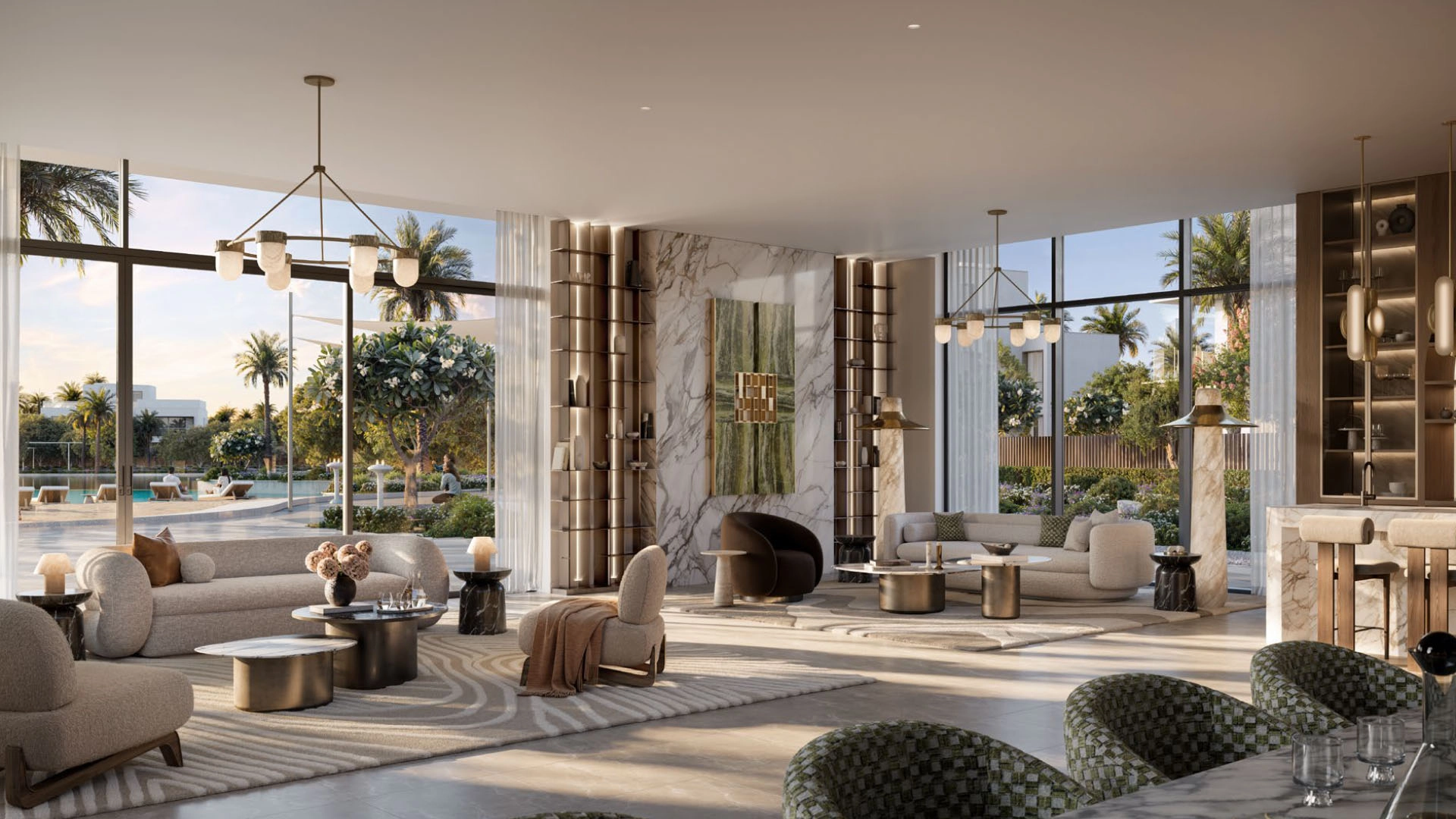 The villas feature a refined collection of 4-, 5-, and 6-bedroom homes, designed to welcome natural light and embrace peaceful views. Architecture is contemporary and clean, with subtle water-inspired touches, while interiors are finished in earthy tones and soft neutrals that feel warm, elegant, and practical for real family life. Built-up areas range from 7,254 to 12,779 sq ft, with multiple layout options to suit different lifestyles.