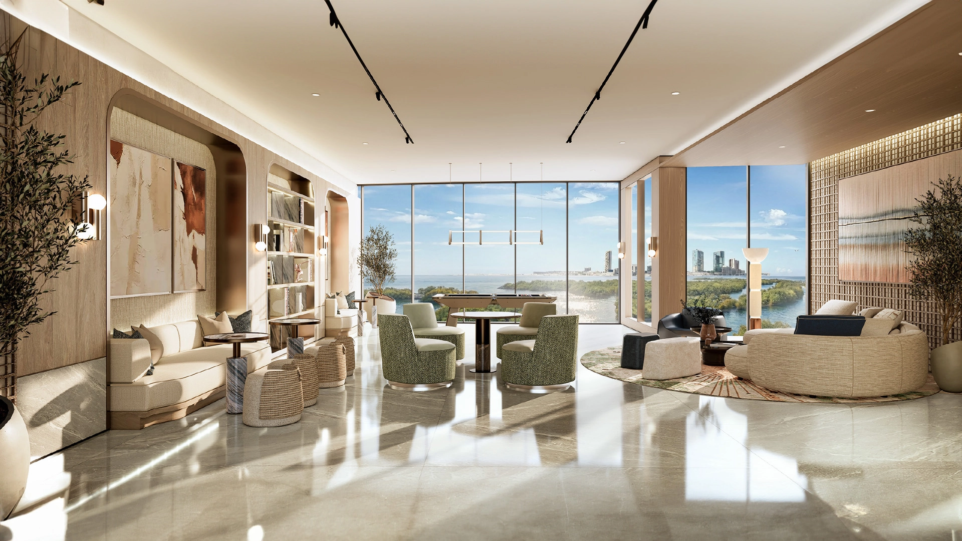 The architecture features horizontal lines and wraparound balconies that frame views of the sea and the city. Glass balustrades, gentle curves, and planted podium decks contribute to a resort-like ambience for the tower. Elevated parking moves vehicles away from the street, creating a more serene, greener arrival experience.