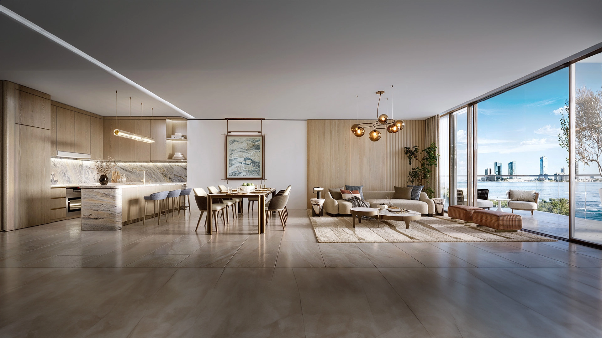 Homes prioritise natural light, ample storage, and seamless flow: Studios ~444 –561 sq ft; 1-BRs ~803–1,265 sq ft; 2-BRs ~1,322–1,706 sq ft; 3-BRs ~3,061–3,099 sq ft; 2-BR townhouses ~1,883–2,139 sq ft. Expect engineered finishes, modern fitted kitchens, quality bathware, private balconies, and select study or maid’s spaces.