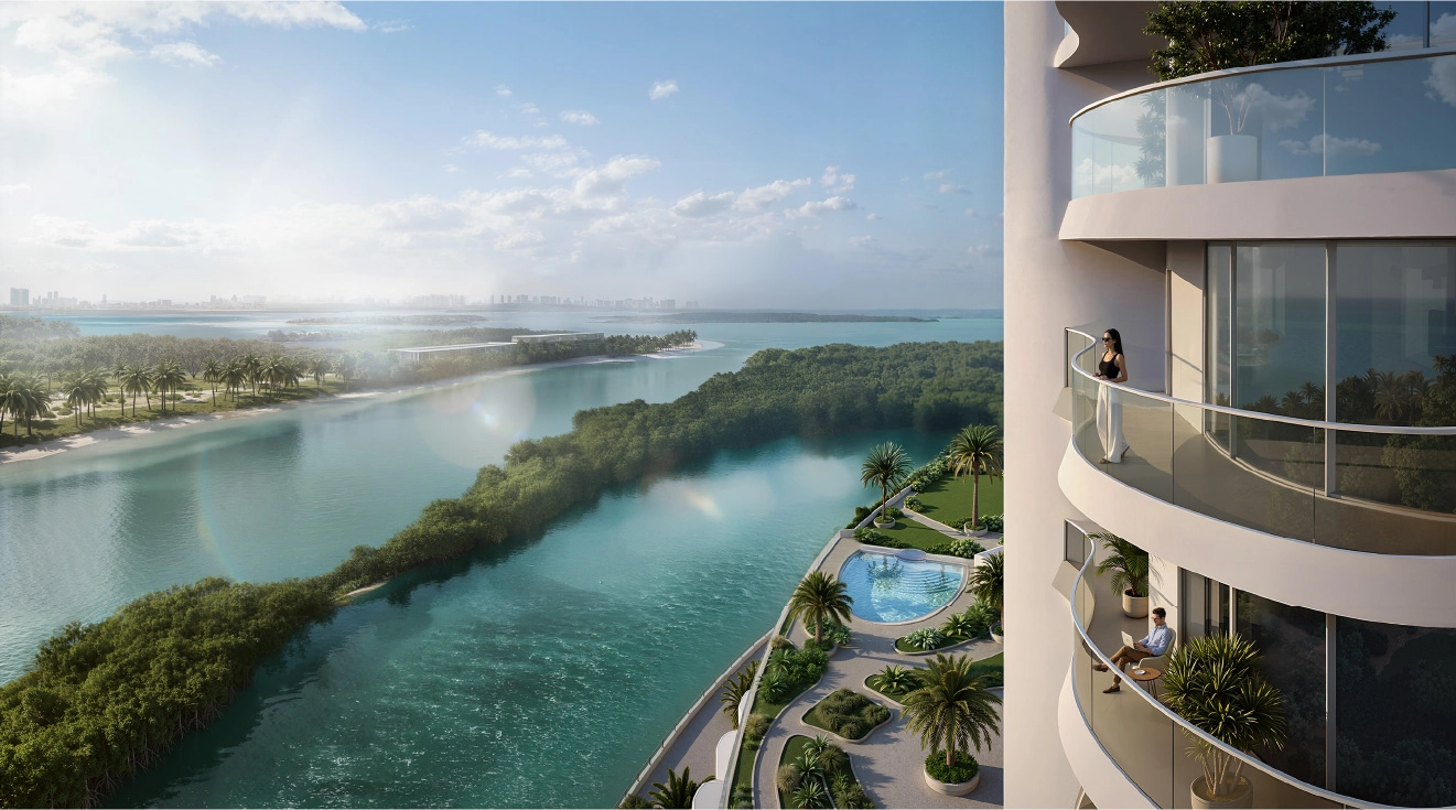 The design features a modern, glass-oriented silhouette that gracefully curves towards the mangroves and canal. Tiered balconies offer expansive views. A lifestyle podium connects the two residential towers, while a third tower completes the overall design. Street-level retail spaces invigorate the area, fostering a vibrant, social environment.