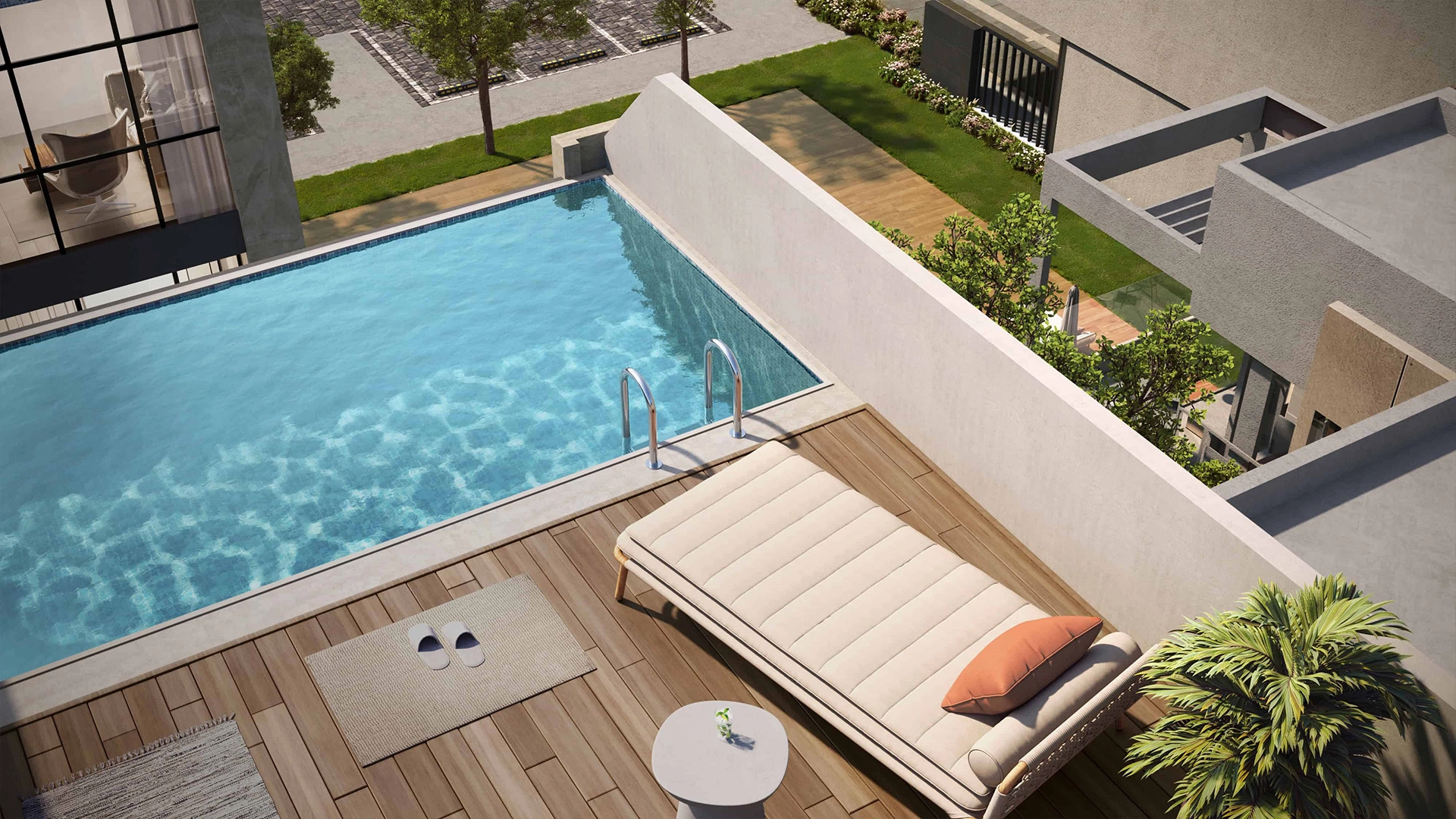 Modern townhouses featuring clean lines, warm tones, and private outdoor spaces. Each home includes private parking and a swimming pool, with an optional internal lift. Streetscapes maintain a human scale while maximising privacy and light across G+3 layouts.