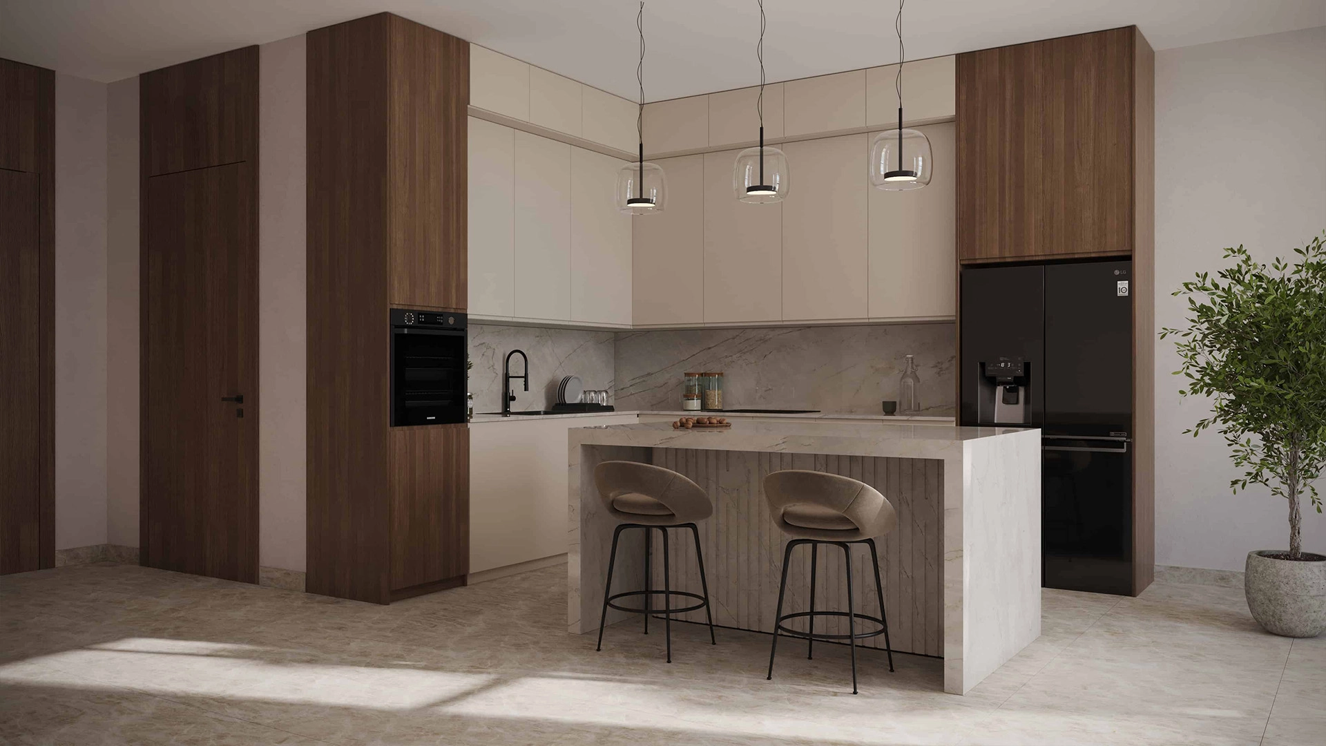 These four-bedroom townhouses include en-suite bedrooms, a maid’s room, fitted kitchens, fully tiled bathrooms, central air conditioning, wardrobes, and balconies or terraces.