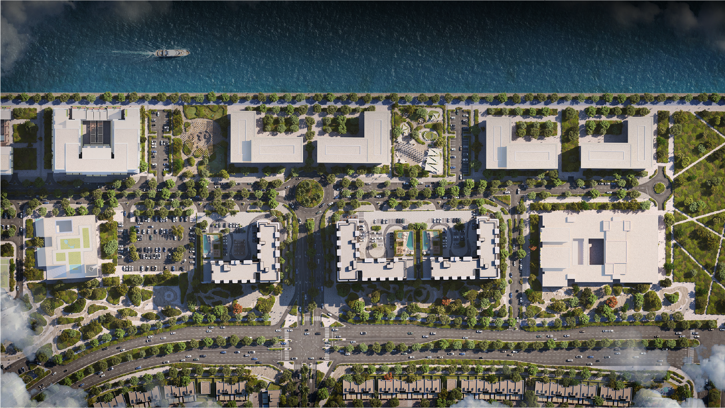 The clean and modern buildings line the canal and landscaped courtyards. The ground levels are lively, featuring lounges and entrances to various amenities, while shaded areas and plantings help maintain a comfortable microclimate. Each building serves as a small community, with access controlled for residents and their guests.