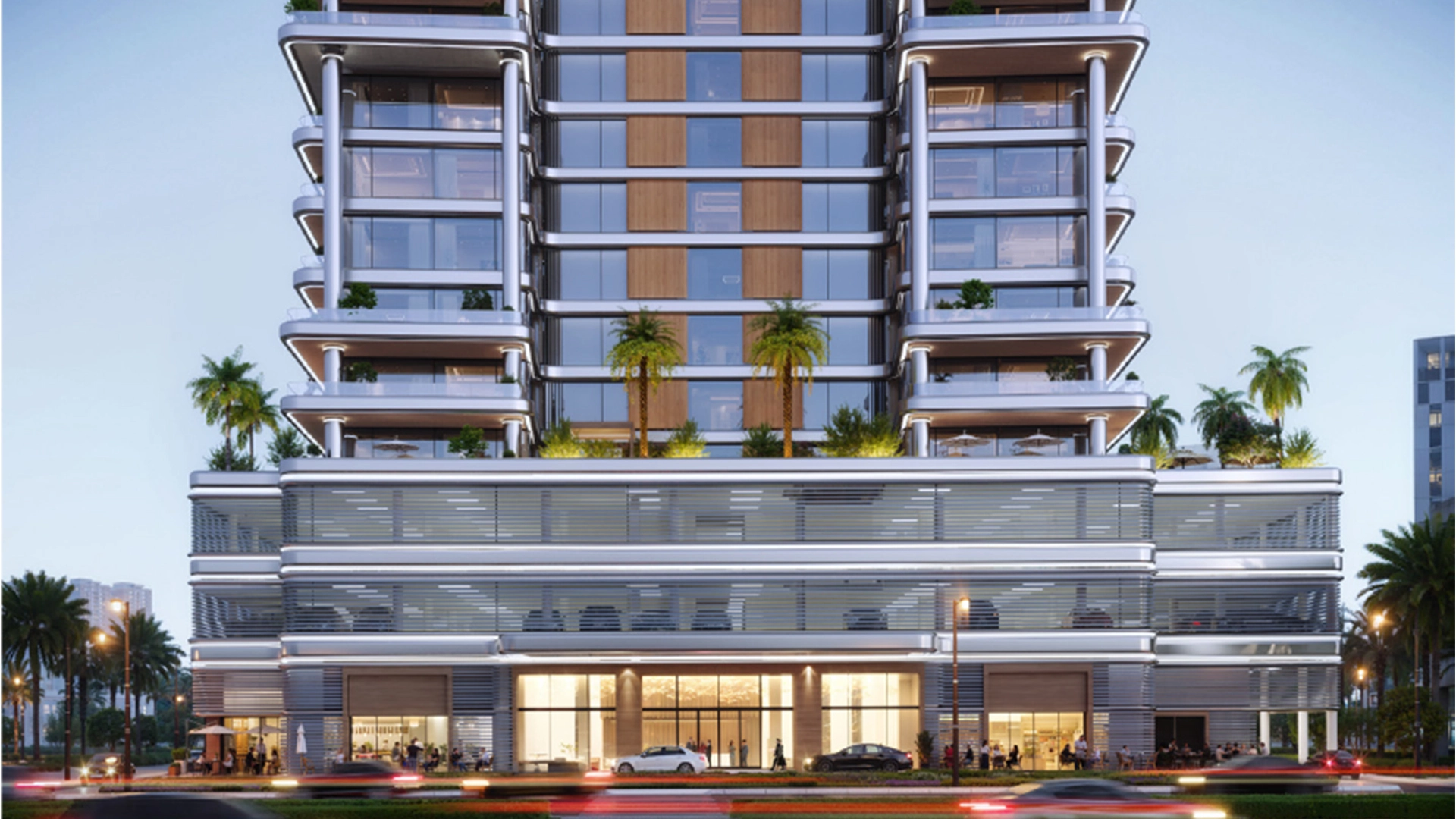 The design features a contemporary and clean aesthetic. The structure consists of a multi-level podium with three basement levels, a ground floor, and two parking levels, transitioning to 21 residential floors and a roof. Soft materials and expansive glass allow for ample natural light, while shaded edges and landscaped borders help keep the building calm and inviting.