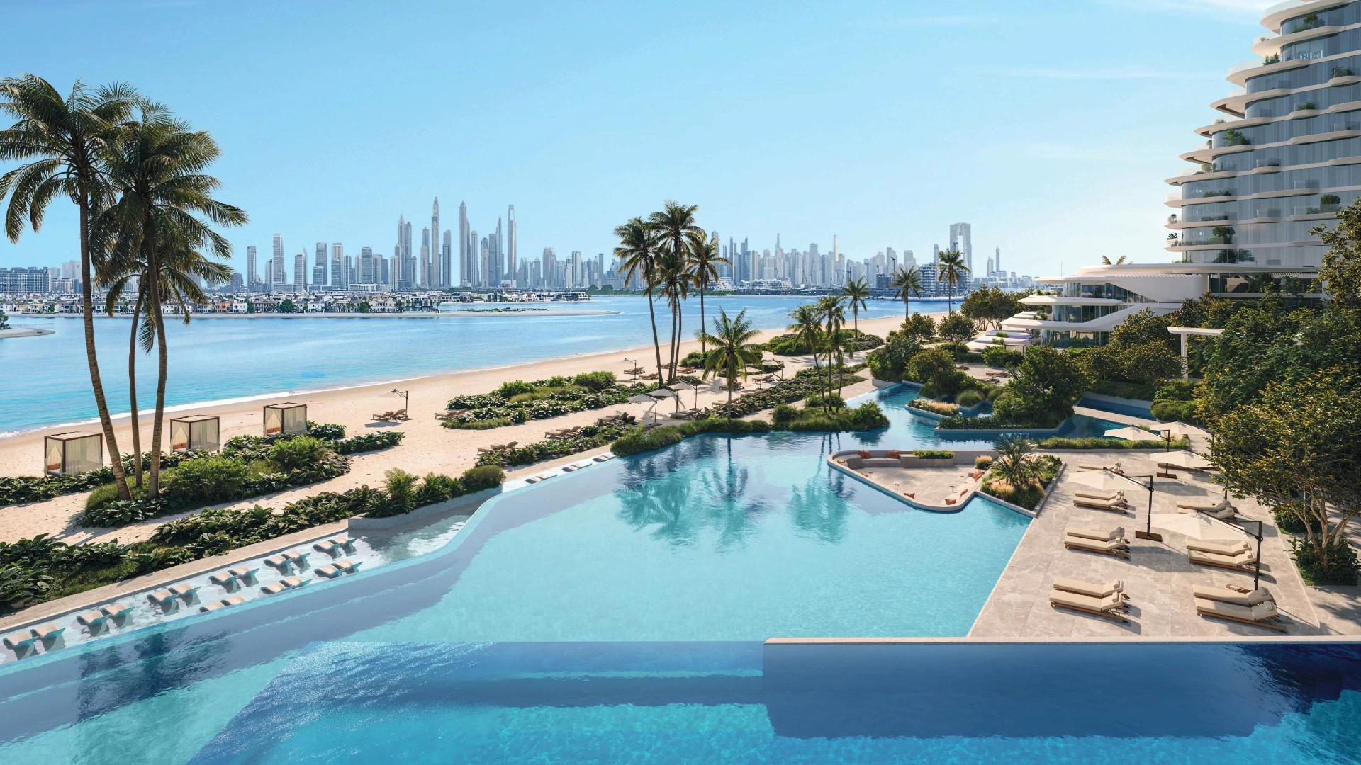 The tower resembles stacked seashells. Curved glass walls and wide terraces capture light and cool sea breezes. A private beach and palm trees surround the base.