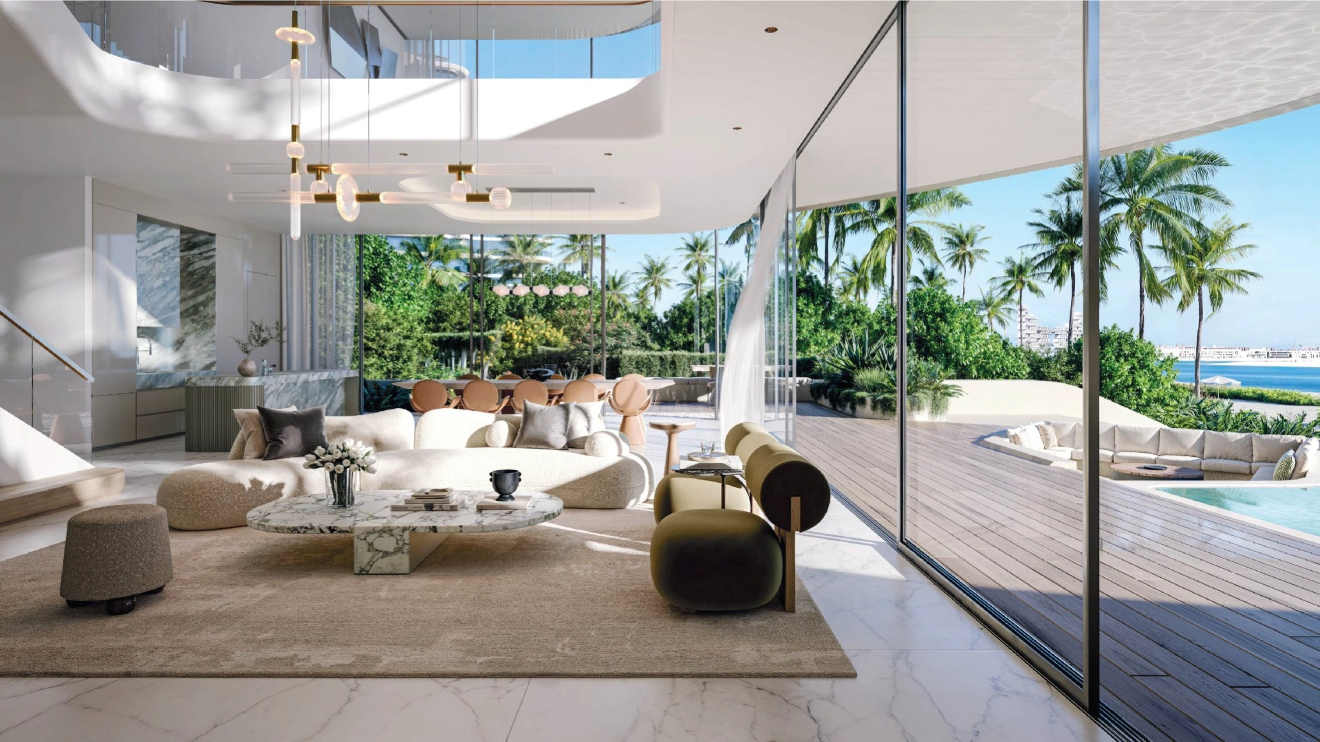 Homes begin at approximately 4,470 square feet for two-bedroom units and can exceed 21,000 square feet for the seven-bedroom sky penthouse. Each home features open kitchens that connect to spacious living rooms and expansive decks. With three-meter ceilings, smart controls, premium fittings, and staff rooms, these residences offer a comfortable and convenient lifestyle.