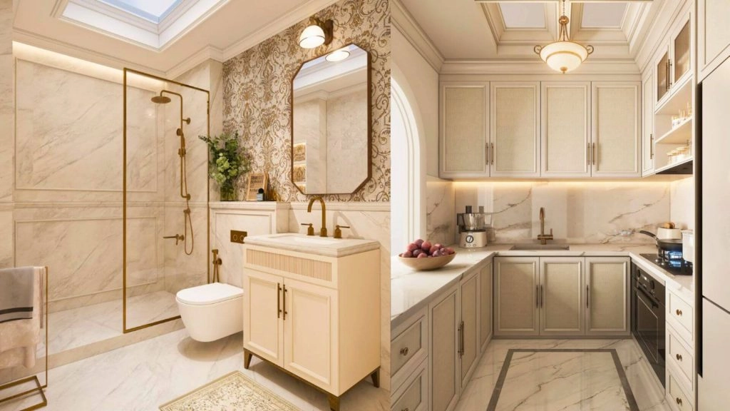 The homes are fully furnished and feature semi-closed kitchens equipped with branded appliances. Each unit features a private garden measuring 3×3 meters, and the living areas open onto outdoor spaces. The interiors boast marble floors, warm timber accents, built-in wardrobes, and premium sanitary ware, creating a timeless atmosphere.