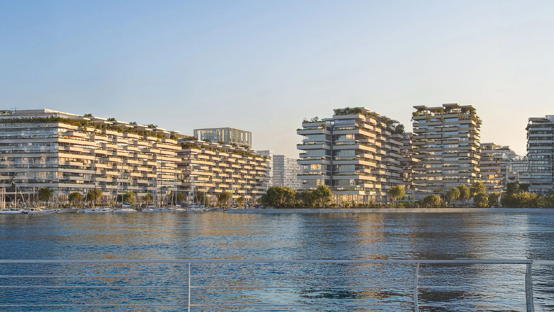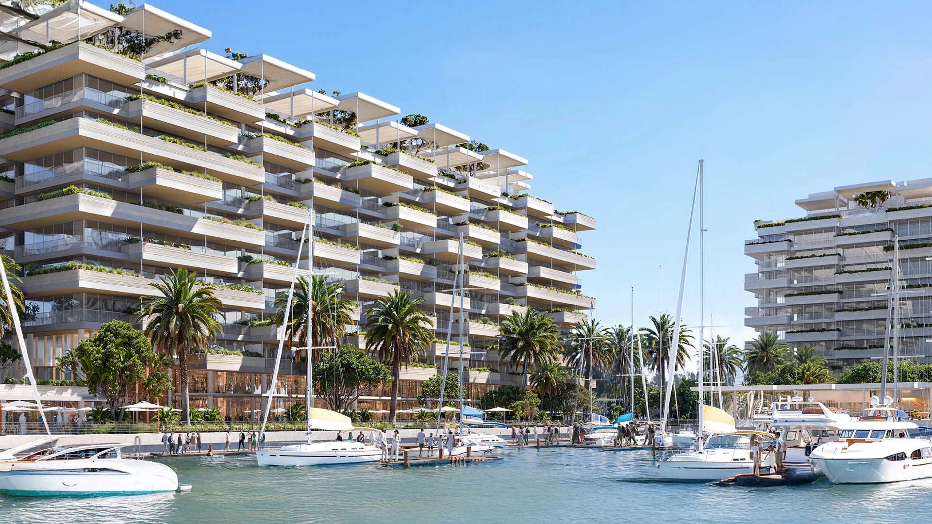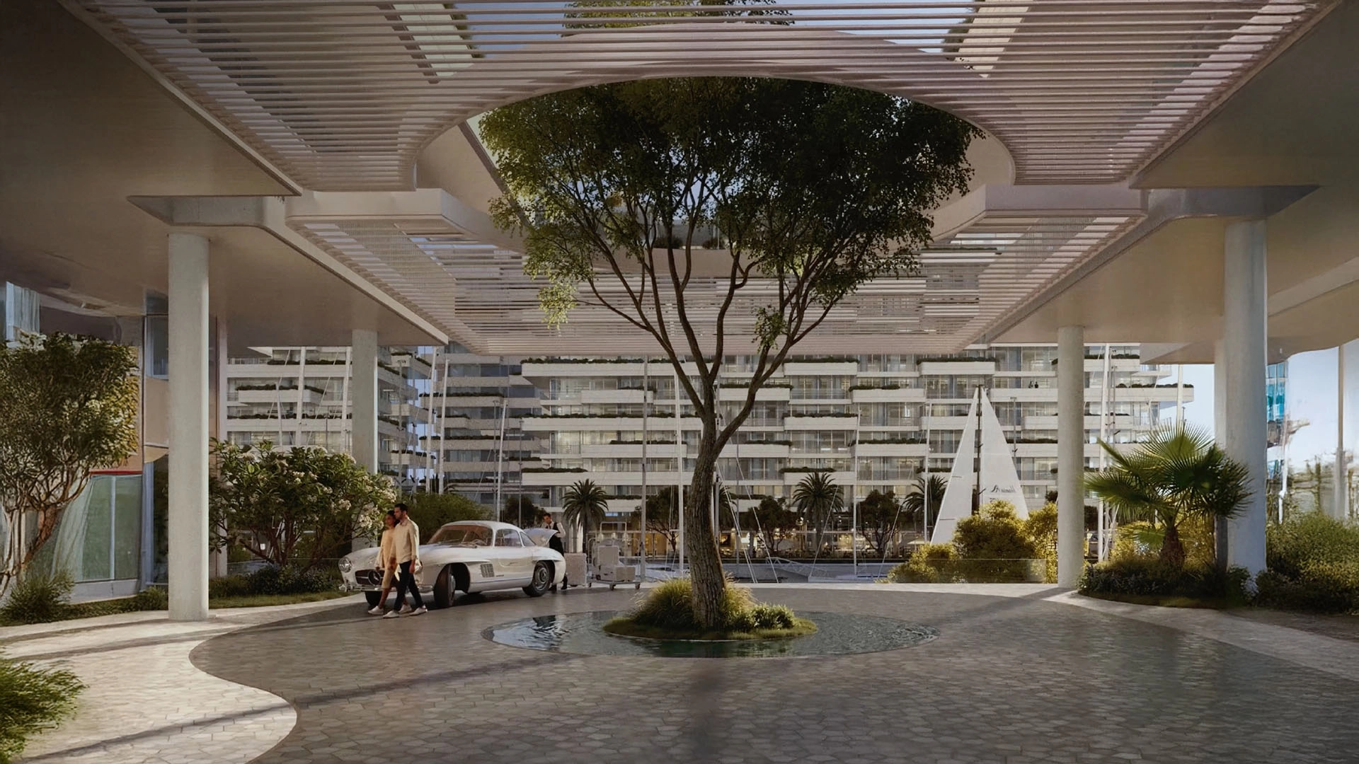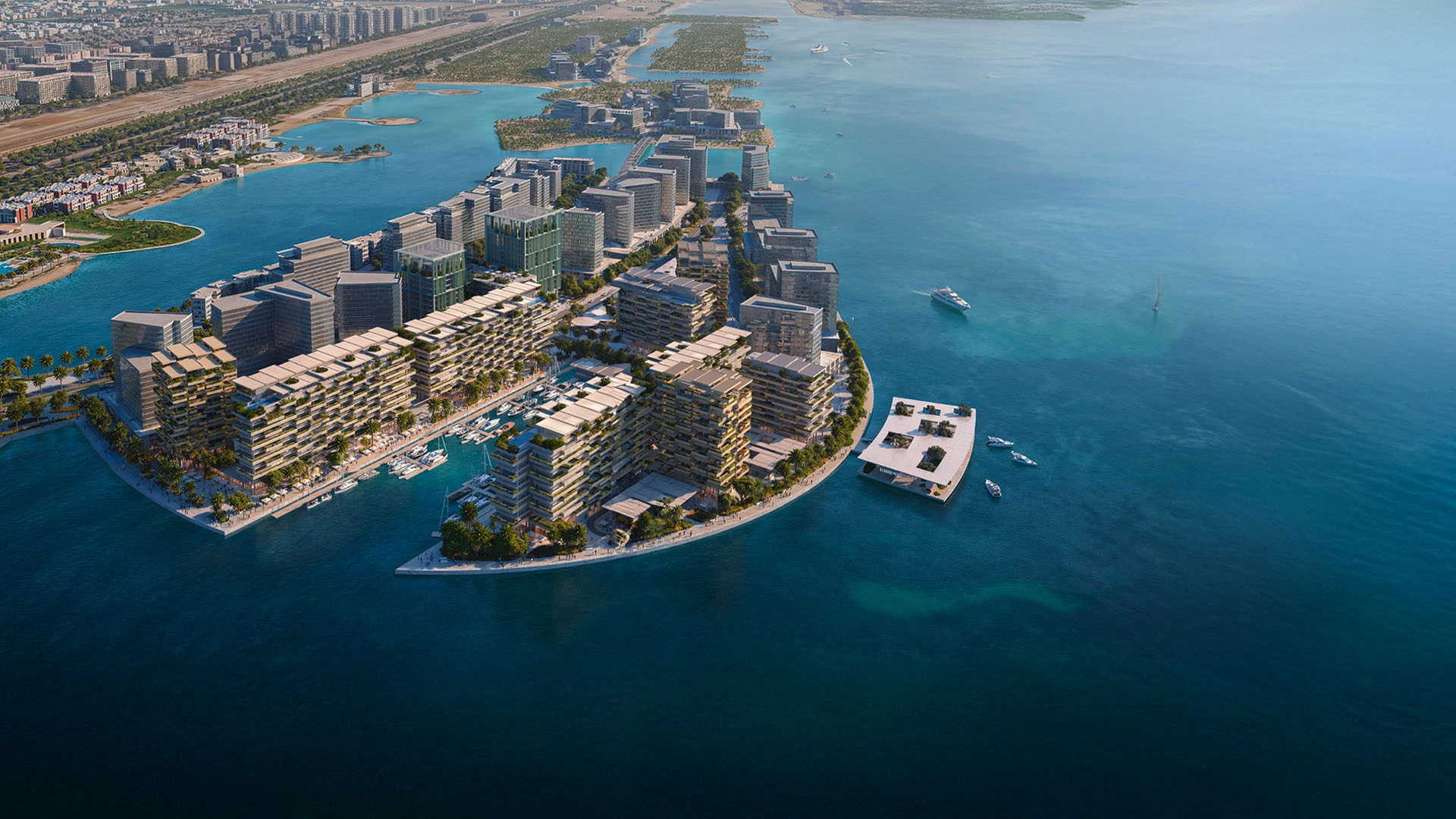 The design emphasises light, water, and greenery. Buildings are oriented to frame views of the marina and skyline, featuring large glass panels and shaded terraces. Planted edges and water features help soften the microclimate and enhance the public space. The overall result is a modern waterfront aesthetic that remains practical for the sun and heat of Abu Dhabi.