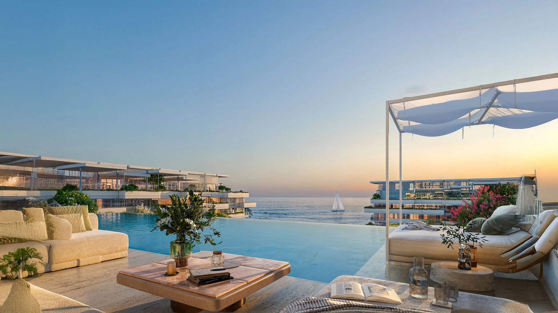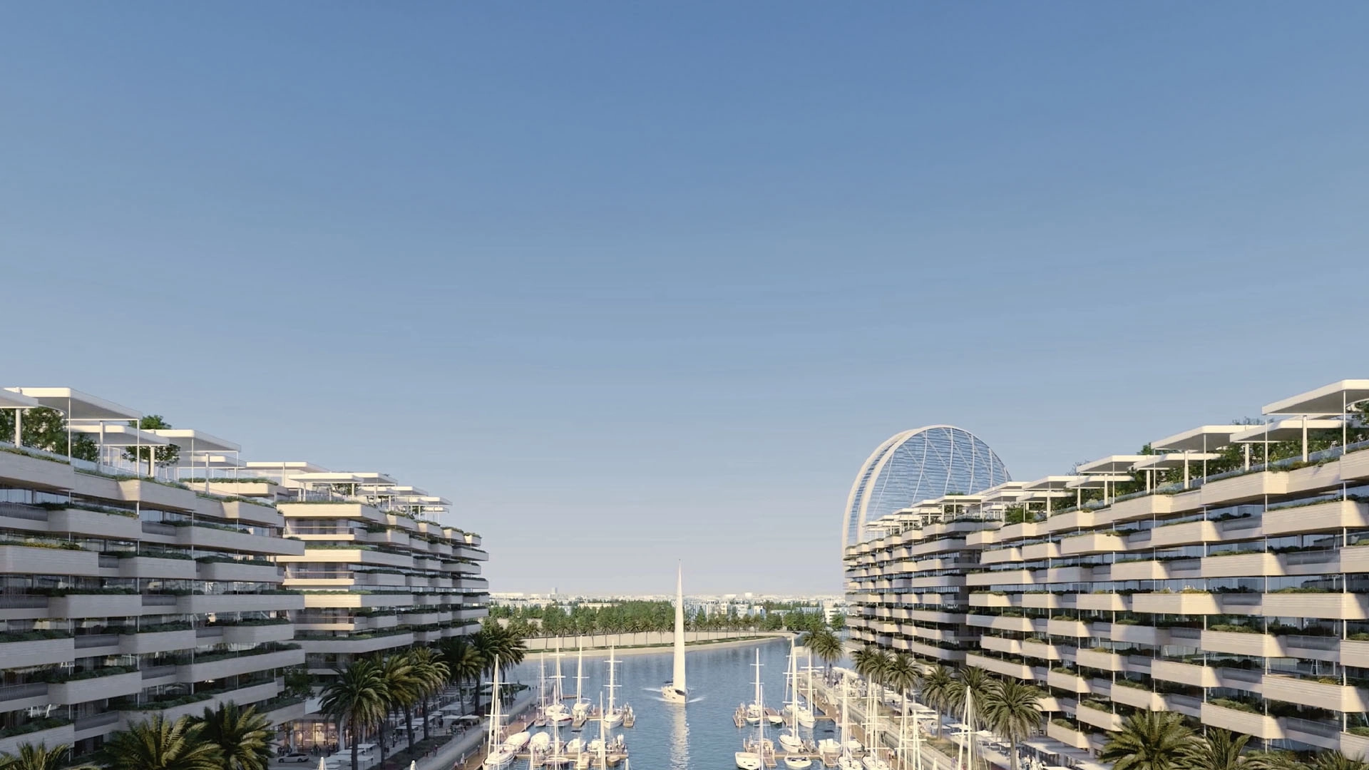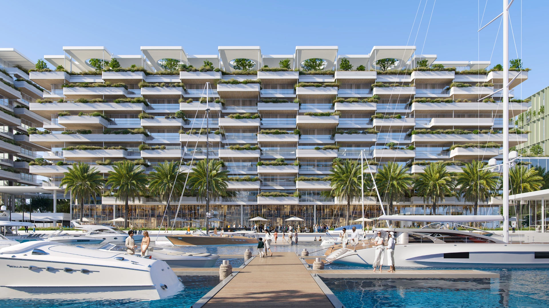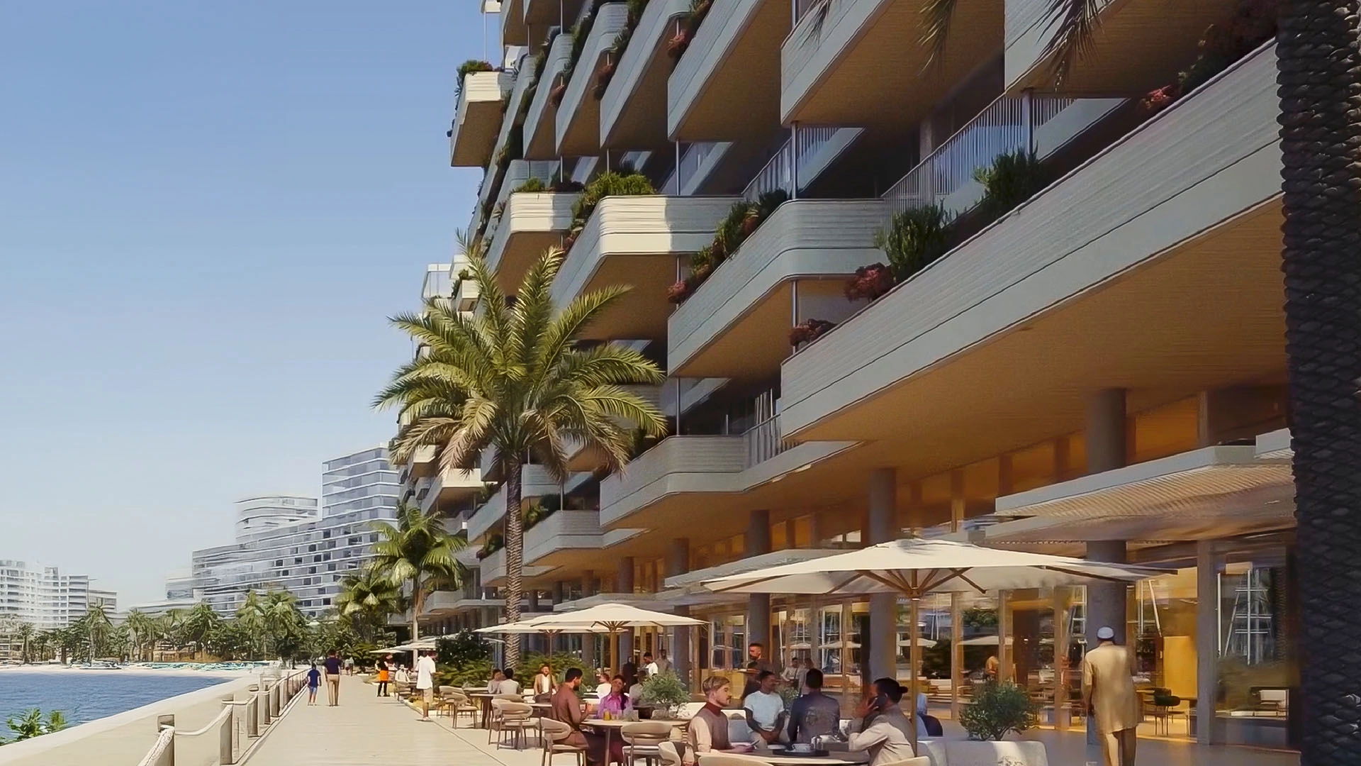 The design emphasises light, water, and greenery. Buildings are oriented to frame views of the marina and skyline, featuring large glass panels and shaded terraces. Planted edges and water features help soften the microclimate and enhance the public space. The overall result is a modern waterfront aesthetic that remains practical for the sun and heat of Abu Dhabi.