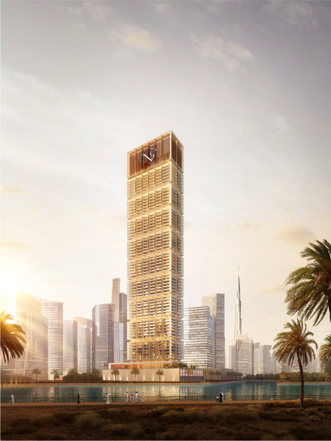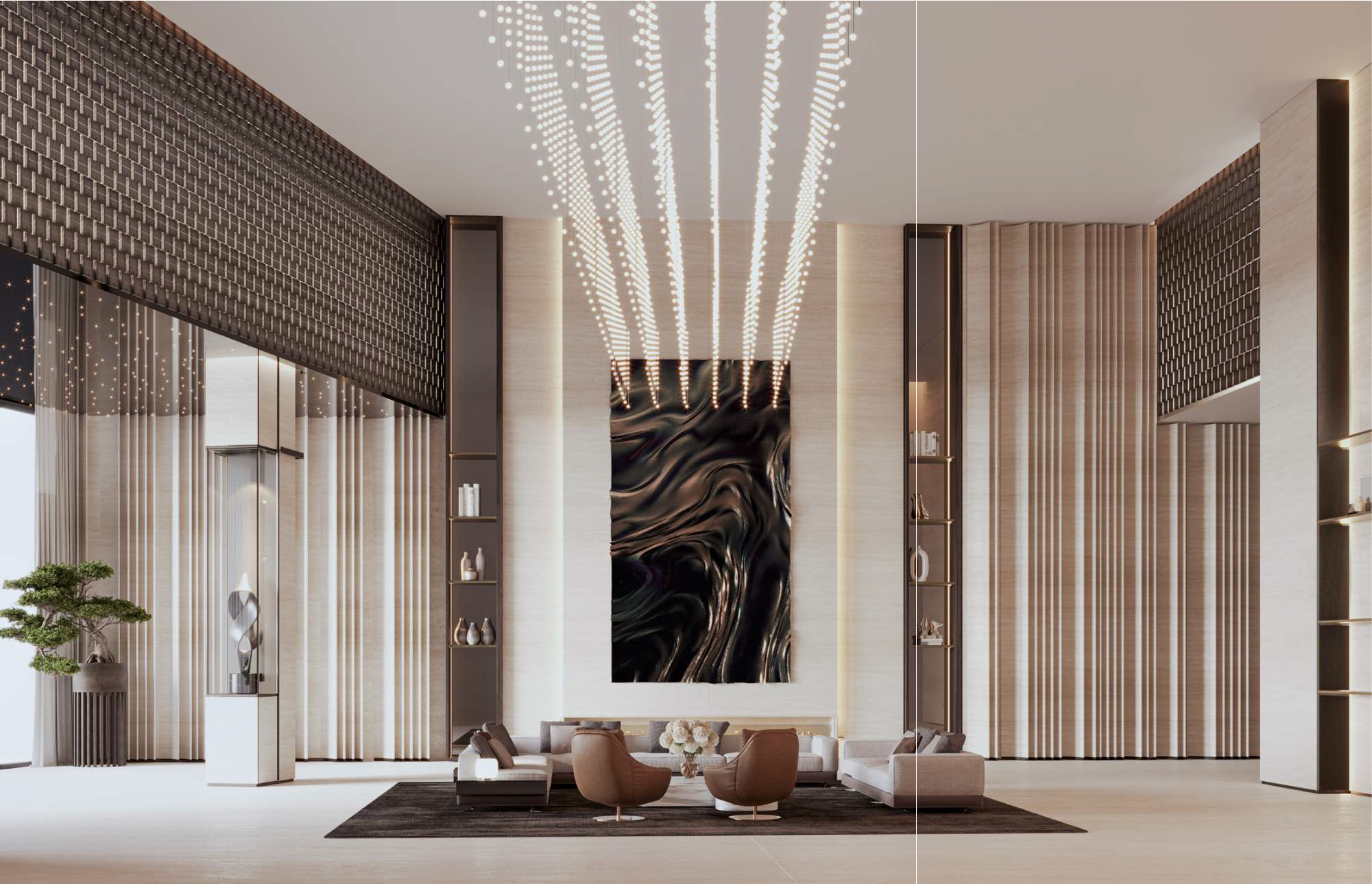 Architecture & Exteriors – Facades marry classical cornices with crisp bronze glass and Cipollino-stone slabs. Layered balconies, vertical fins and planted pockets soften the skyline while shading interiors from Dubai’s sun.