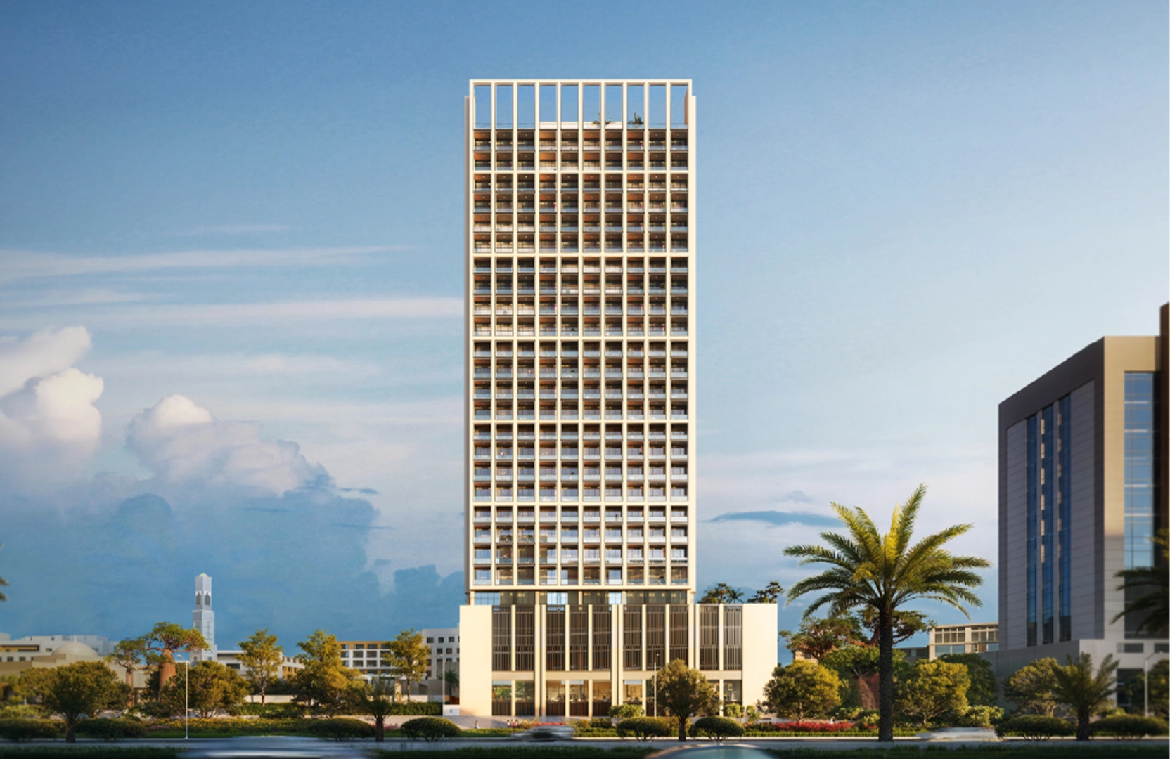 Setting & Masterplan – Anchoring a corner plot in JVC, the single 37-storey tower rises above a car-free podium garden and retail colonnade. Tree-lined paths connect to parks, Circle Mall and Al Khail Road, blending low-density calm with swift city links.