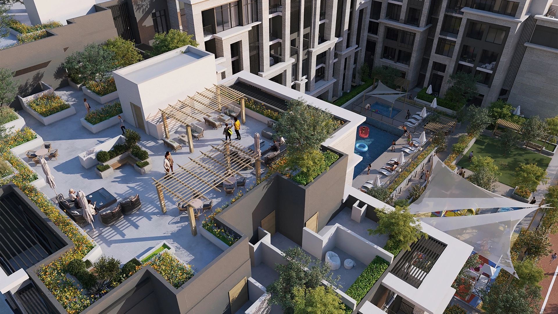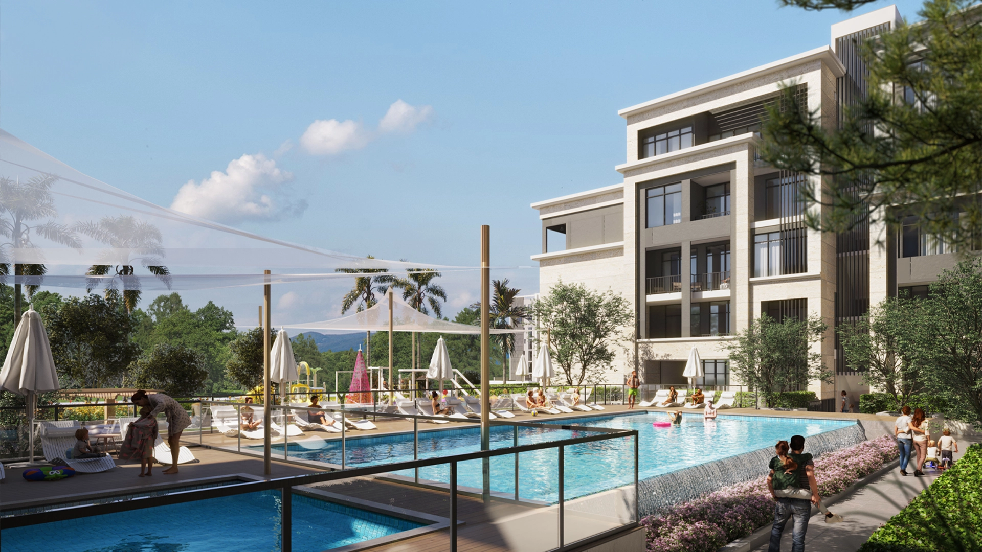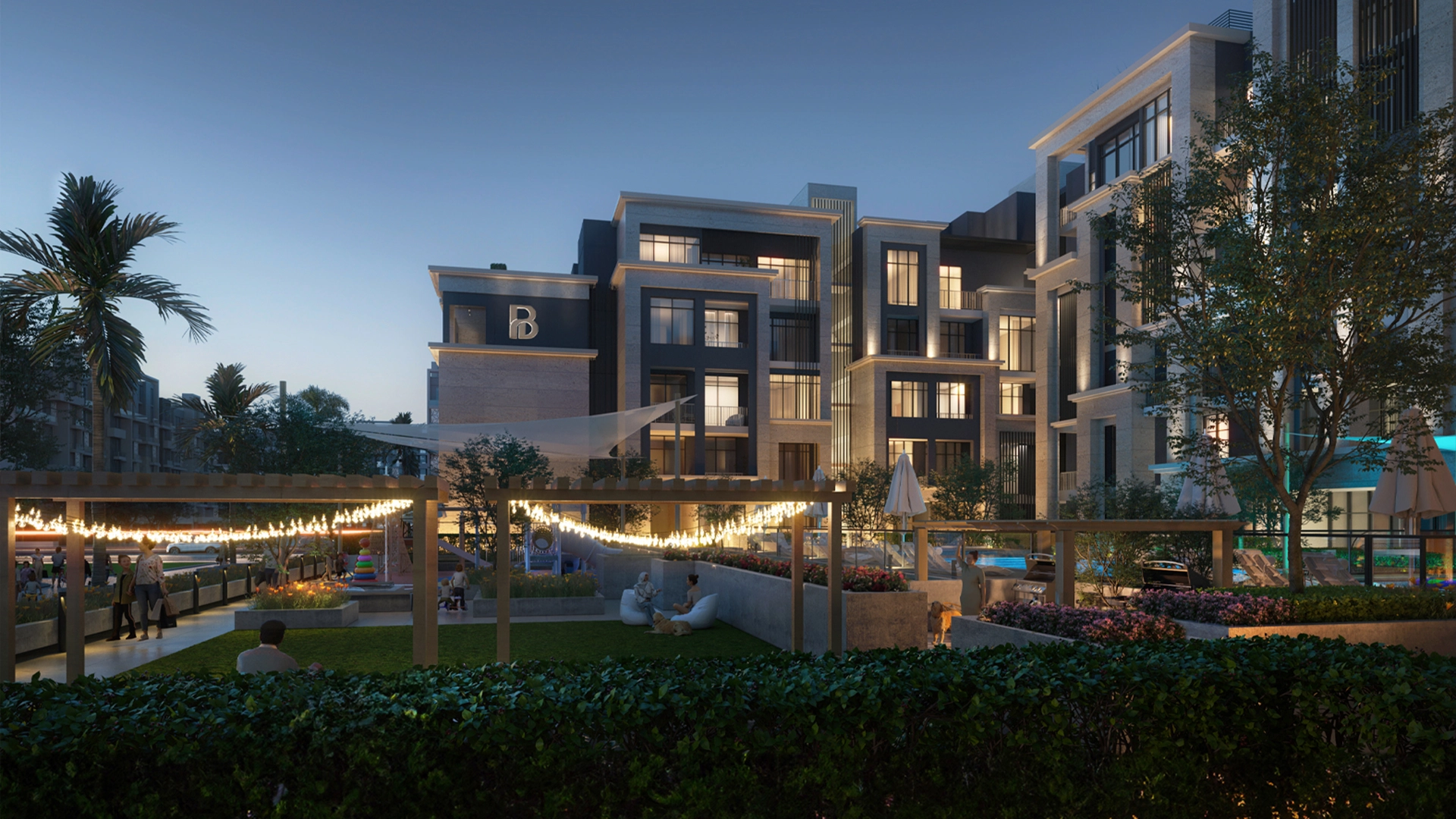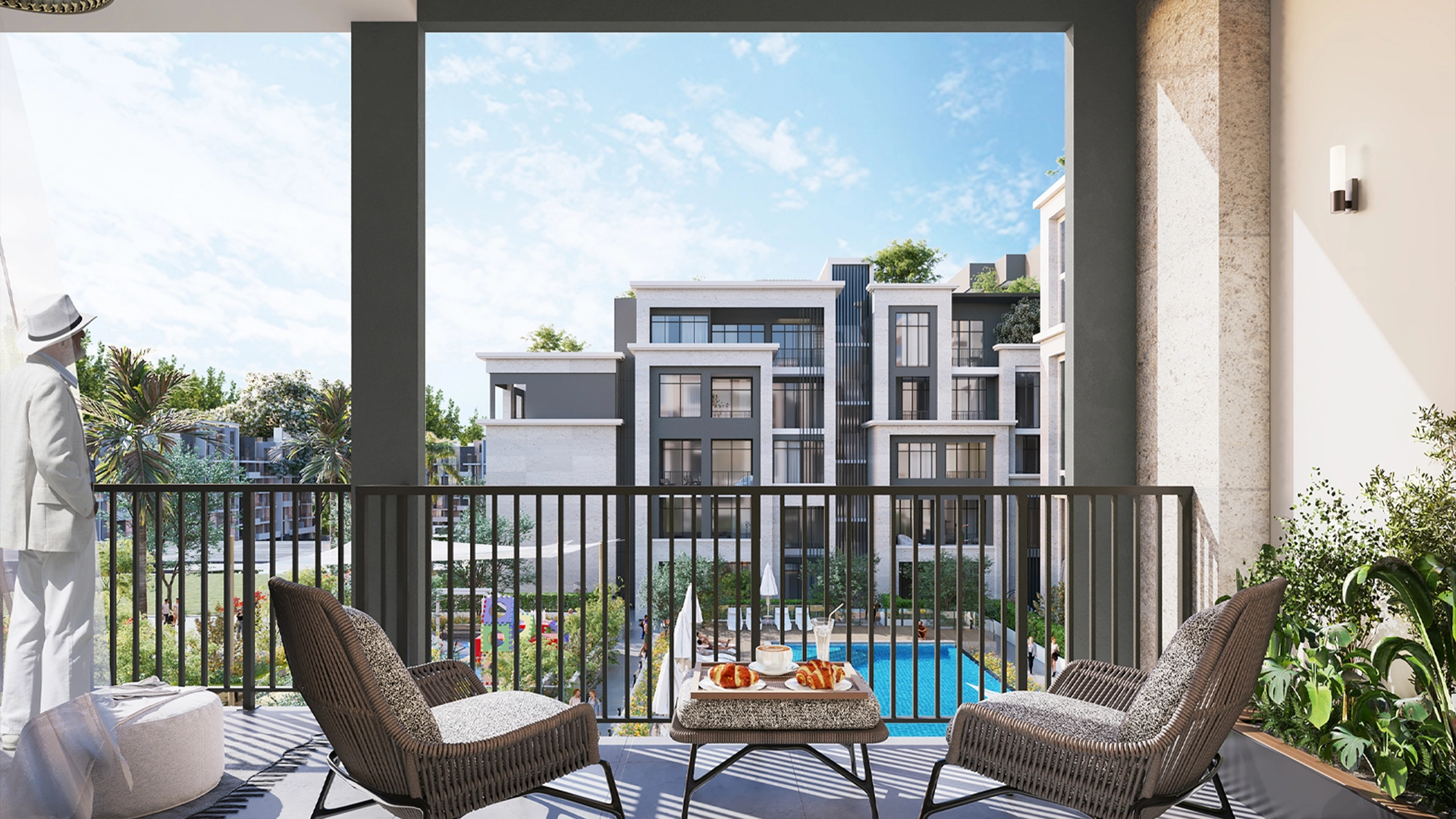 A boutique, low-rise address shaped with neoclassical English cues and contemporary lines. Broad glazing, shaded balconies and landscaped edges frame quiet views. Pool courtyards, rooftop cafés, and green pockets soften the built form, keeping the street level inviting and people-first.
