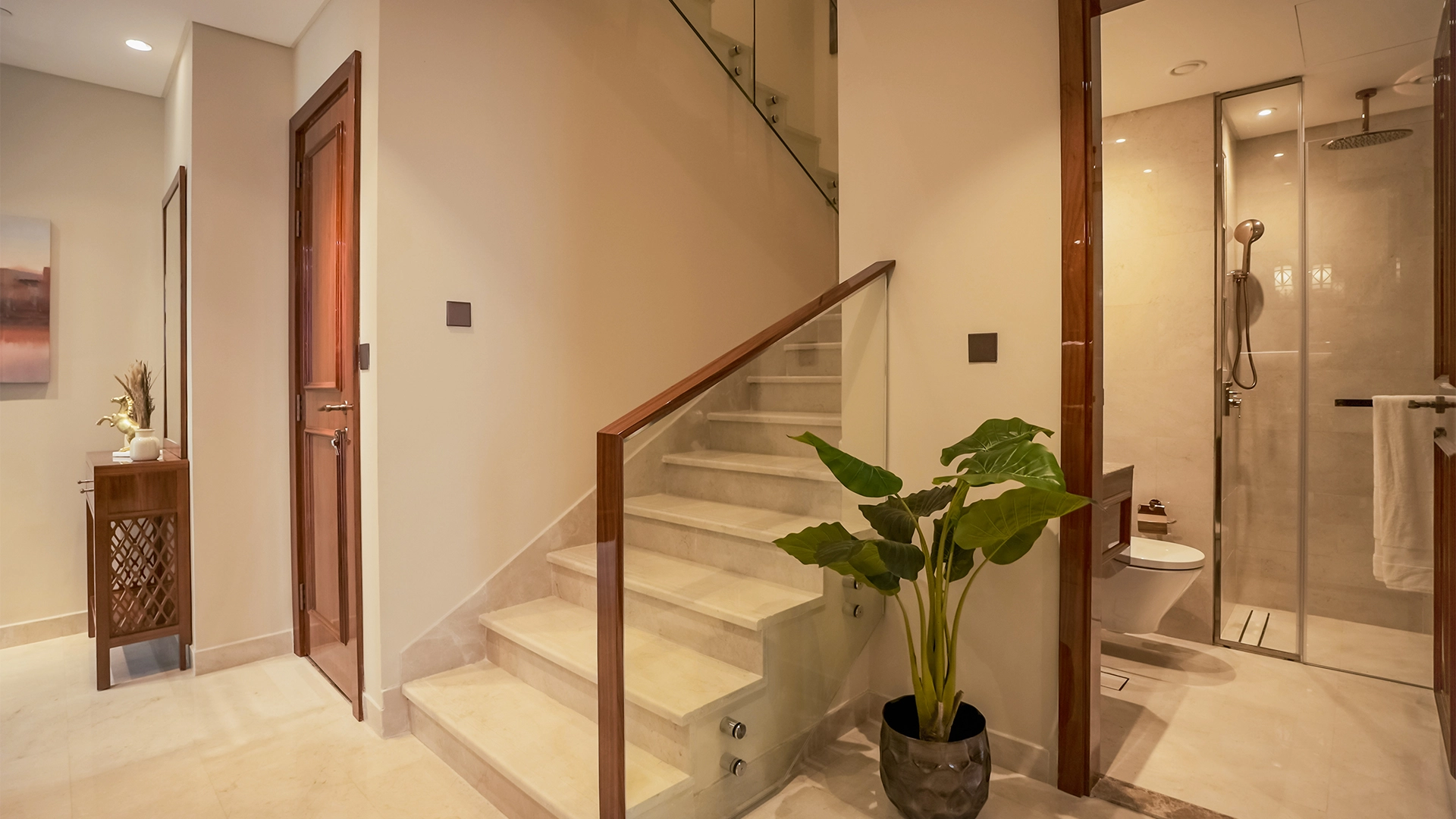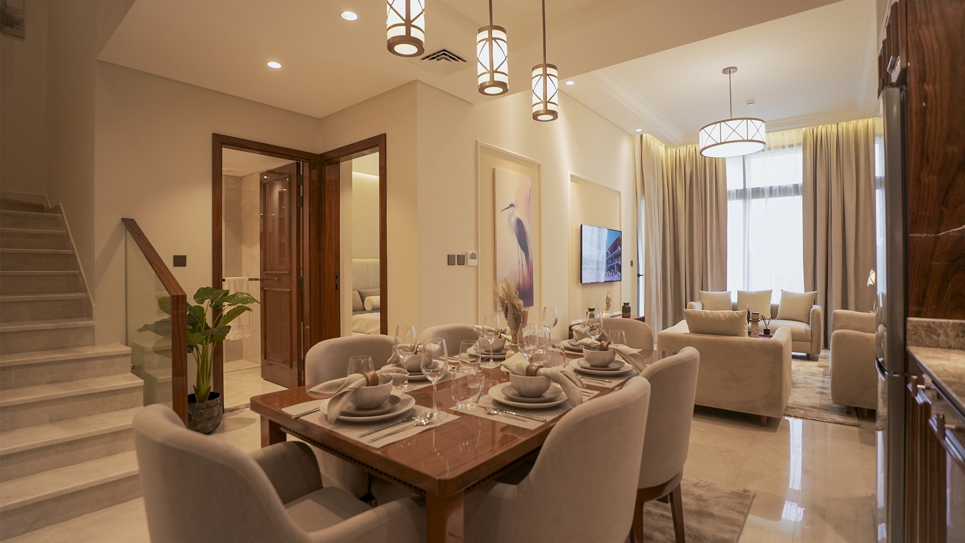 Inside, fully furnished residences emphasise space and flow. Finishes utilise high-quality materials that align with Estidama Pearl 3 standards. Homes start at approximately 960 sq ft and feature private balconies on select models. Plans range across 2–4 BR apartments, duplexes and limited triplex formats for larger households.